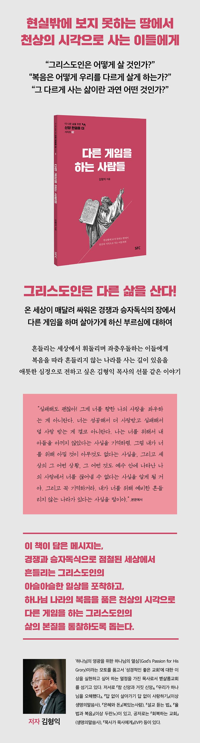 저자는 승자에게 모든 인기와 영광이 주어지는 세상에서 겉으로 내세울 만한 것이 없는 삶으로 인해 위축되어 있는 신자들을 복음의 무대로 초청한다. 저자의 초청 메시지는, 예수 그리스도께서 십자가에서 이루신 일로 말미암아 우리는 완전히 다른 게임을 하는 존재가 되었으니 그 존재에 어울리는 다른 삶을 살자는, 애틋한 격려이자 열광적인 응원이다. 그래서 저자는 ‘다른 게임을 하는 사람들’이라는 주제로 메시지를 전하고, 그것을 다듬어 『다른 게임을 하는 사람들』이라는 책으로 출간하였다. 신자답게 사는 일상을 소망하는 이들에게는 선물 같은 이야기가 될 테다!