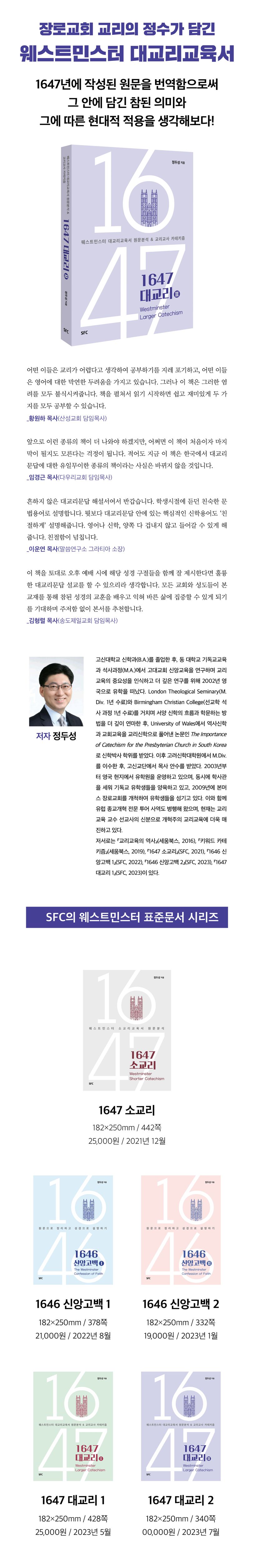 “나에게 있어서 이번에 출간되는 『1647 대교리2』는 너무나 값지다. 이 책의 출간으로 웨스트민스터 소교리교육서, 대교리교육서, 신앙고백의 이 세 문서의 원문을 분석하고 정리한 자료가 한국에 처음으로 소개되는 것이기 때문이다. 거기에 더해 이 작업을 할 수 있는 상황과 기회가 나에게 주어졌다는 것이다. 모든 것이 다 하나님의 은혜와 섭리가 아닐 수 없다.