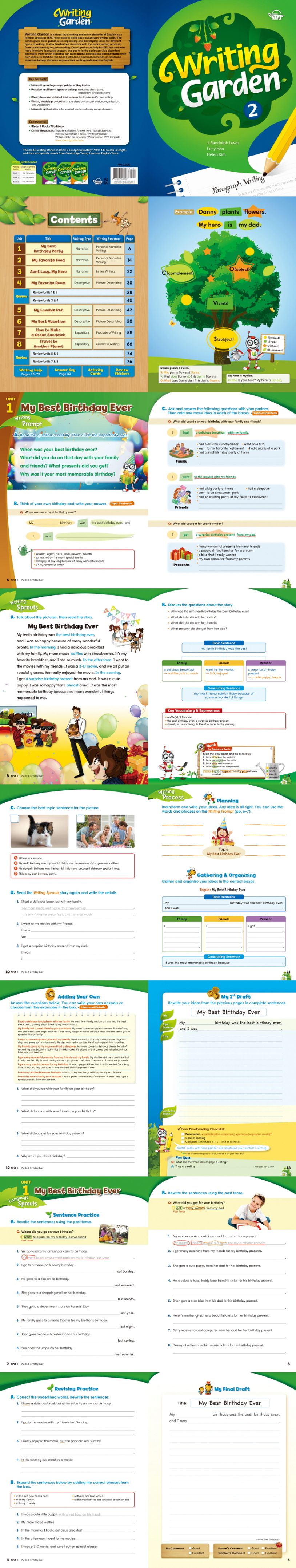 단계적 글쓰기를 통한 Paragraph Writing의 기초 완성. Writing Garden 시리즈 『2권』. 110~140단어 길이의 주제별 영어 글쓰기를 연습하는 교재. 영어 예문과 아이디어 예시가 풍부하게 제공되어 학습자의 영어능력과 사고력을 동시에 향상시킬 수 있다. 여러 단계를 밟아가며 글을 완성시켜 가는 Process Writing으로 올바른 쓰기 방법을 배울 수 있다. 가장 자주 접하는 narrative, descriptive, expository, persuasive의 네 가지 유형의 글을 연습한다. 책 뒤편에 제공되는 문장 카드를 이용해서 영어의 문장 구조 학습을 효과적이고 즐겁게 할 수 있다. 학습자의 연령에 맞는 흥미로운 주제와 삽화, 도표 등이 영어 글쓰기의 부담감을 덜어주고 좀 더 즐거운 경험이 되도록 한다.