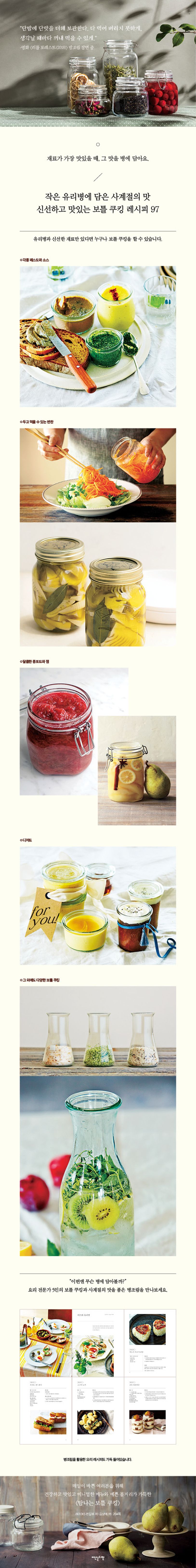 저장병을 활용한 레시피 열풍은 유럽과 일본에서 먼저 시작됐다. 주로 선도를 유지해야 하는 샐러드나 병에 예쁘게 담아내는 디저트가 주를 이루는데, 이 책에선 신선도와 시각적인 요소 외에도 병에 담는 저장식 요리가 가진 다양한 장점을 5인의 요리 전문가와 함께 예찬한다.