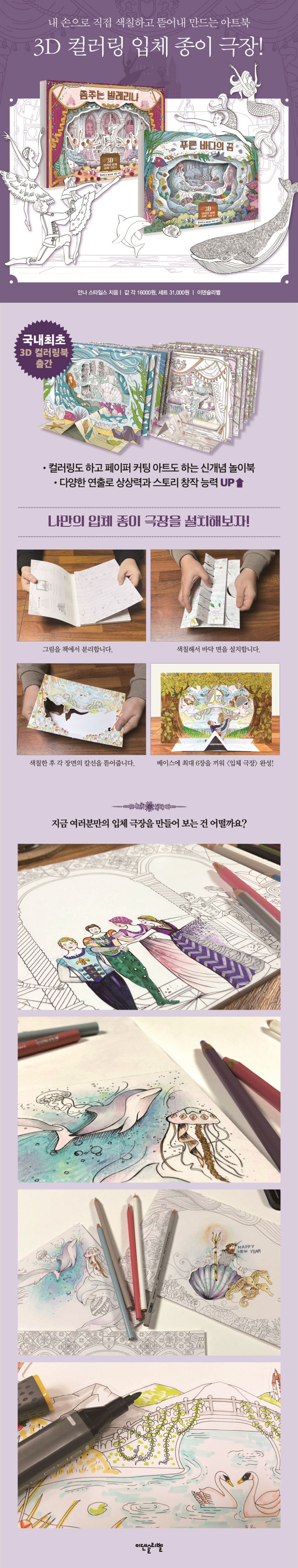 국내 최초로 신개념 컬러링북 3D 입체 극장 시리즈가 출간되었다. 누구보다 먼저 아름다운 인어, 물고기와 산호초, 난파된 바닷속 보물선, 바다의 왕 포세이돈 등 신비로운 해저 왕국의 아름다움을 담은 ‘입체 극장’을 만들어보자. 잠시 숨 가쁜 일상을 지워두고 예쁜 그림에 컬러링을 하는 즐거움과 손으로 뜯어 만드는 입체 종이 공예의 재미에 푹 빠져보자.