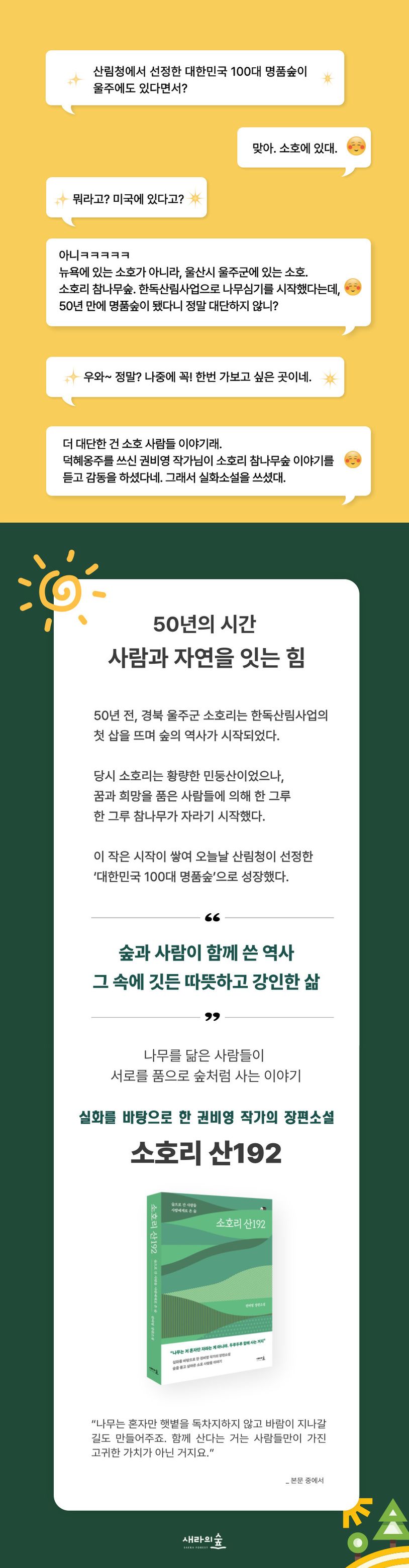 실화를 바탕으로 한 권비영 작가의 장편소설 『소호리 산192』는 50년 전, 울산시 울주군 소호리의 이야기입니다. 한독산림사업의 첫 삽이 땅에 놓였을 때, 소호리는 그저 민둥산이었습니다. 사람들은 나무를 심기 시작했습니다. 솜털 같은 아기나무들은 그들에게 꿈이었고, 미래였습니다. 자식을 키우듯 나무를 심고, 나무가 자랄 때마다, 사람들은 더 나은 내일을 꿈꿨습니다. 나무는 숲이 되었습니다. 그 숲은 단순한 나무의 집합이 아니라, 사람들의 희망이 담긴 터전이었습니다. 그들의 땀과 희망은 오늘날 대한민국 산림청이 선정한 100대 명품숲이 되었습니다.