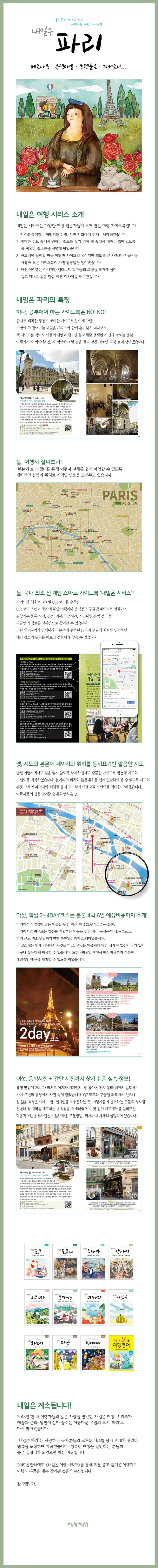 『내일은 파리 ? 내일은 파리-베르사유, 몽생미셸, 퐁텐블로, 지베르니』는 글자로 빼곡한 무겁고 방대한 가이드북에 지친 이들을 위해 한 손에 들어오는 책 사이즈에 여행의 설렘과 즐거움을 더해줄 생생한 사진과 여행에 꼭 필요한 알찬 정보만을 선별해 담아냈다. 프랑스 여행을 처음 떠나는 이들을 위한 프랑스 여행 시 알아두면 유용한 정보는 물론 파리는 어떤 곳일까? 파리 여행 언제가 좋을까? 파리에선 뭘 먹을까? 파리 약국에선 뭘 살까, 프랑스 레스토랑 이용하기, 파리에서 쇼핑하기 등 파리 여행에 꼭 필요한 정보만 쏙쏙 골라 담아냈으며, 베르사유 궁전, 퐁텐블로, 오베르 쉬르 우아즈, 지베르니, 몽생미셸 등 파리에서 가볼 만한 프랑스 북부의 주요 명소까지 소개하였다. 또한 유람선을 타고 즐기는 로맨틱 파리, 에펠탑 인생 사진은 여기에서, 파리에서 즐기는 달팽이 요리 등 파리 여행에서 꼭 먹어봐야 할 음식과 파리의 다양한 즐길거리를 SPECIAL TOMORROW 테마로 구성해 소개하였으며, 스마트한 여행을 위해 가이드북 최초로 명소와 식당마다 QR 코드를 수록하여 QR코드 스캔만으로 구글맵 홈페이지와 연동될 수 있도록 하였다.