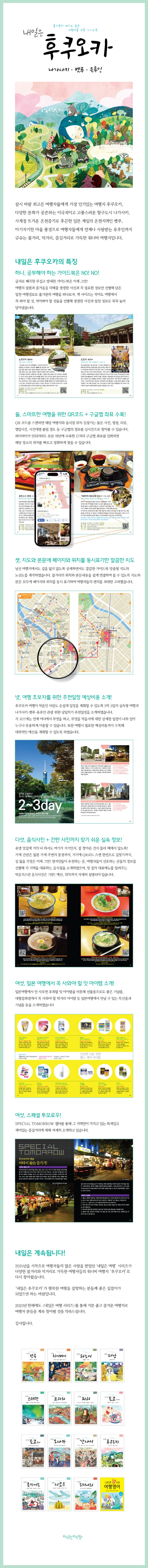 2023~2024년 최신개정판으로 돌아온 『내일은 후쿠오카-나가사키, 벳푸, 유후인』은 코로나 이후 2023년 최신 여행정보를 담았다. 국내 가이드북 최초로 명소별 QR코드를 수록하여 QR코드 스캔과 동시에 길 찾기는 물론 사진, 평점, 리뷰, 영업시간, 시간대별 붐빔 정도 등 구글맵의 정보를 실시간으로 확인할 수 있도록 하였다. 내일은 시리즈는 여행을 사랑하는 전문가들이 모여 취재하고 수집해 온 자료 중에서 꼭 필요한 정보만을 엄선해 알차게 담아낸 가이드북이다. 후쿠오카, 나가사키, 벳푸, 유후인에서 꼭 가봐야 할 대표 명소와 꼭 먹어봐야 할 명물 음식은 물론 ‘후쿠오카의 명물 야타이 즐기기!’, ‘일본 3대 라멘, 하카타 라멘 파헤치기!’, ‘가족 여행객들을 위한 반나절 추천 여행’, ‘후쿠오카·벳푸·유후인에서 즐기는 당일치기 온천 체험’ 등 그 지역에서만 즐길 수 있는 다양한 체험활동을 SPECIAL TOMORROW 테마로 구성해 소개하였다. 글자로 빼곡한 무겁고 방대한 가이드북에 지친 이들을 위해 한 손에 들어오는 책 사이즈에 여행의 설렘과 즐거움을 더해줄 생생한 사진과 꼭 필요한 정보만을 선별해 담아냈다.