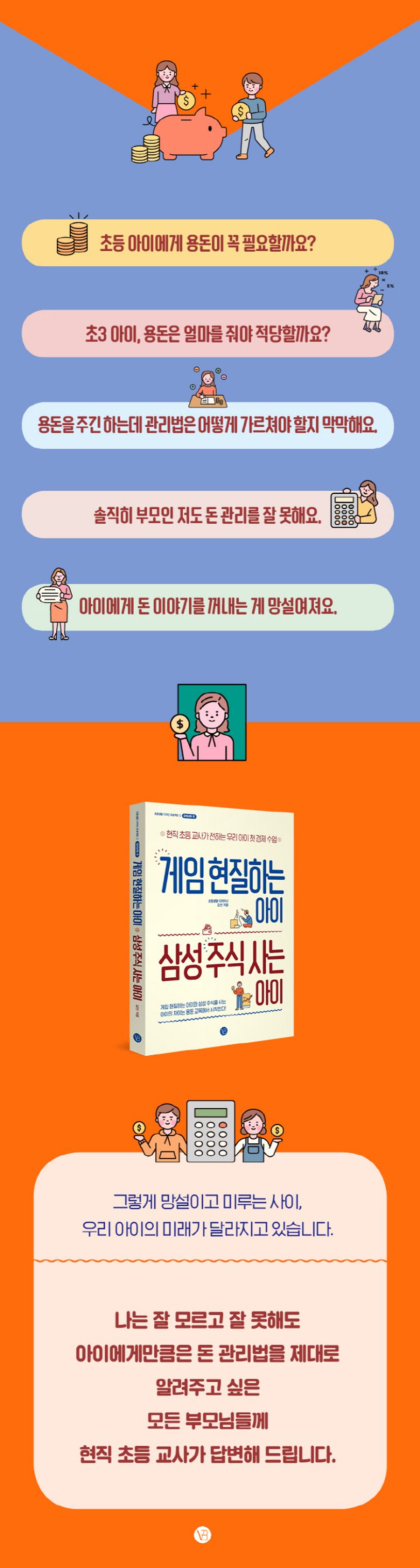 중고생들을 대상으로 진행한 설문에서, 세 명 중 두 명의 아이가 부모로부터 금융지식을 얻는다고 대답했다. 이것은 부모가 올바른 금융지식과 금융태도를 갖추어야 아이들에게 제대로 된 돈 교육을 할 수 있다는 의미이기도 하다. 이에 따라 이 책에는 아이 용돈 교육을 위해 필요한 최소한의 금융 관련 지식도 담았다. 초등 아이와 함께 부모의 금융지식도 함께 자라는 길잡이 같은 책이 될 것이다.