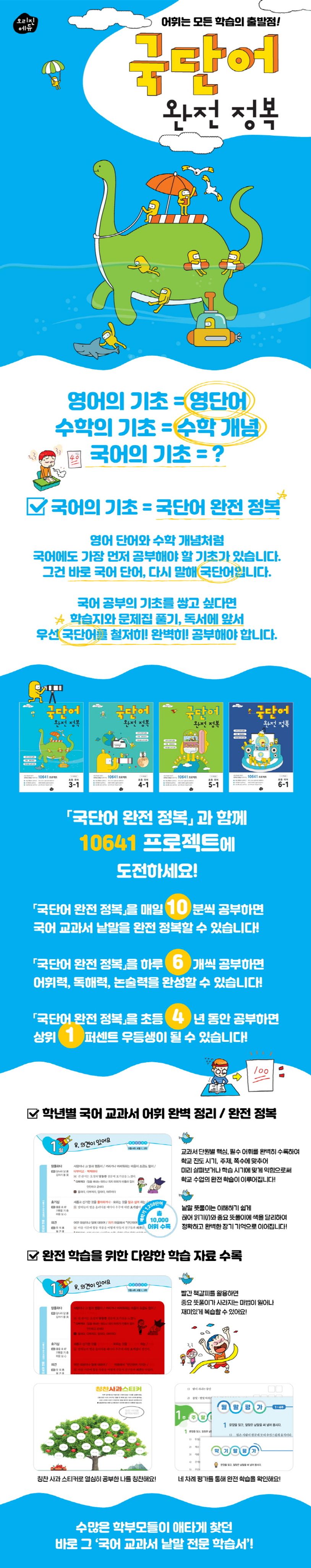 "국단어 완전 정복"은 초등 4년(3~6학년) 동안 국어 교과서에 수록된 매 학기 1,250개 어휘, 총 10,000개의 핵심, 필수 어휘를 단원별로 완벽하게 정리하였다. 낱말 뜻풀이는 이해하기 쉽게, 끊어 읽기(/)와 중요 뜻풀이에 색을 달리하였으며 제공되는 빨간 책갈피와 함께 활용하면 정확하고 완벽한 장기 기억으로 이어진다. 또한 일일, 주말, 월말, 학기말로 이어지는 네 차례의 복습 평가로 교과서에 수록된 어휘를 완전하게 익힐 수 있다. 매일 10분씩, 하루 6개, 초등 4년 동안 꾸준히 학습하면 상위 1퍼센트 우등생이 될 수 있다!