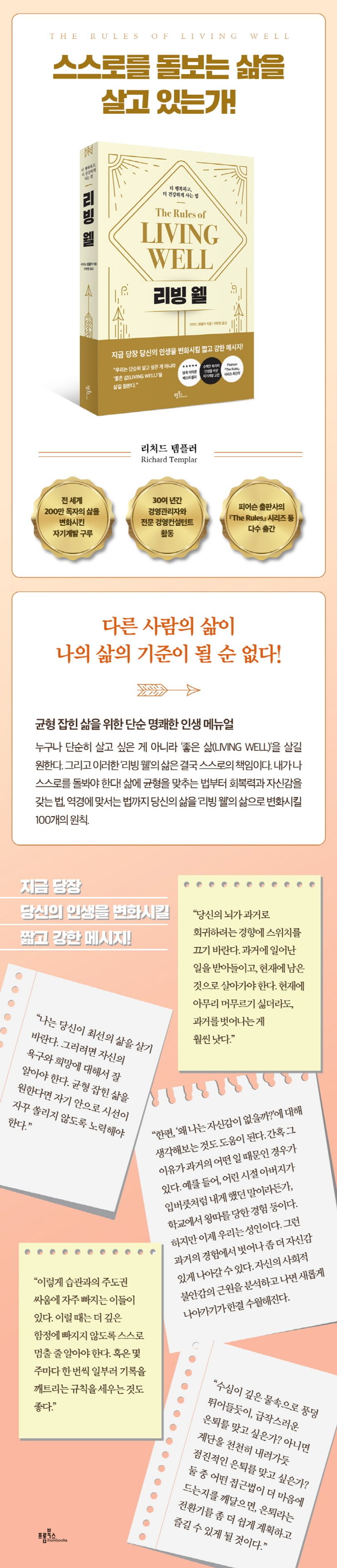 자기계발 고전 『The Rules』 시리즈의 저자인 영국의 베스트셀러 작가 리처드 템플러는 신간 『리빙 웰(The Rules of Living Well)』에서 ‘좋은 삶’으로 나아가기 위해 삶의 어느 시기, 어느 상황에서나 적용 가능한 100개의 원칙들을 소개한다. 이 원칙들은 우리에게 내면을 들여다보고 ‘나는 과연 어떻게 일하고, 생각하며, 느끼는가’를 이해하도록 촉구한다. 오랜 세월 저자는 타인을 관찰하고 그들의 삶으로부터 배우는 과정을 매우 즐겨왔다. 그리고 이로부터 얻은 교훈들로 삶에 균형을 맞추는 법, 회복력과 자신감을 갖는 법, 역경에 맞서는 법을 배웠다. 이 책에는 우리가 스스로를 돌보는 삶을 위해 알아야 할 모든 것이 총망라돼 있다.