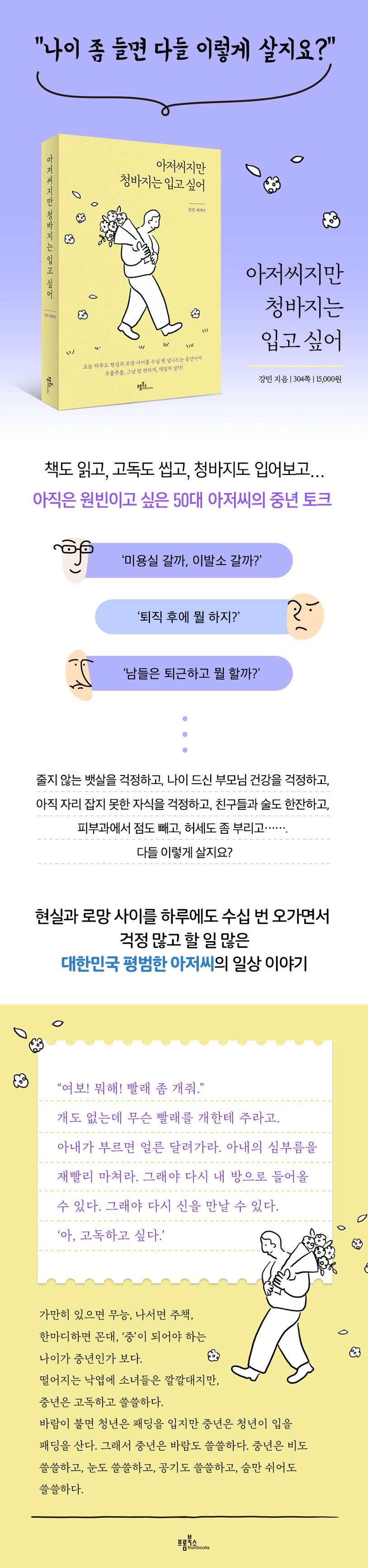 줄지 않는 뱃살을 걱정하고, 나이 드신 부모님 건강을 걱정하고, 아직 자리 잡지 못한 자식을 걱정하고, 친구들과 술도 한잔하고, 피부과에서 점도 빼고, 허세도 좀 부리고……. 당신이 아저씨라면 이 가운데 절반 이상은 공감이 갈 것이다. 그러면서 가끔 궁금해진다. 대한민국의 평범한, 나랑 비슷한 중년의 남자들은 어떻게 사는지. 일주일에 술은 얼마나 마시고, 커피는 하루에 몇 잔을 마시며, 주말엔 무얼 하며 시간을 보내고, 아내 말은 얼마나 잘 듣는지……. 나만 만날 걱정하고 불안하고 고민하는 걸까? 『아저씨지만 청바지는 입고 싶어』는 그런 당신을 위한 책이다.