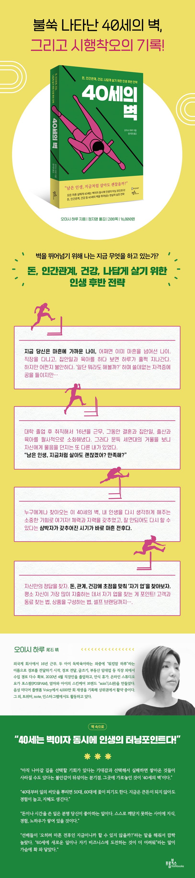 『40세의 벽』은 마흔 전후 ‘이대로 괜찮을까?’ 고민하고 방황하는 사람들을 위한 현실적인 ‘인생 후반 전략’이다. 이즈음 많은 사람이 느끼는 답답한 느낌, 즉 ‘40세의 벽’의 정체를 확인하고, 나답게 사는 인생 후반을 어떻게 디자인해 나갈지 모색해본다. 40대인 두 아이 엄마가 실제로 부딪힌 벽과 그 벽을 뛰어넘는 고군분투의 과정에서 힌트를 얻을 수 있을 것이다.