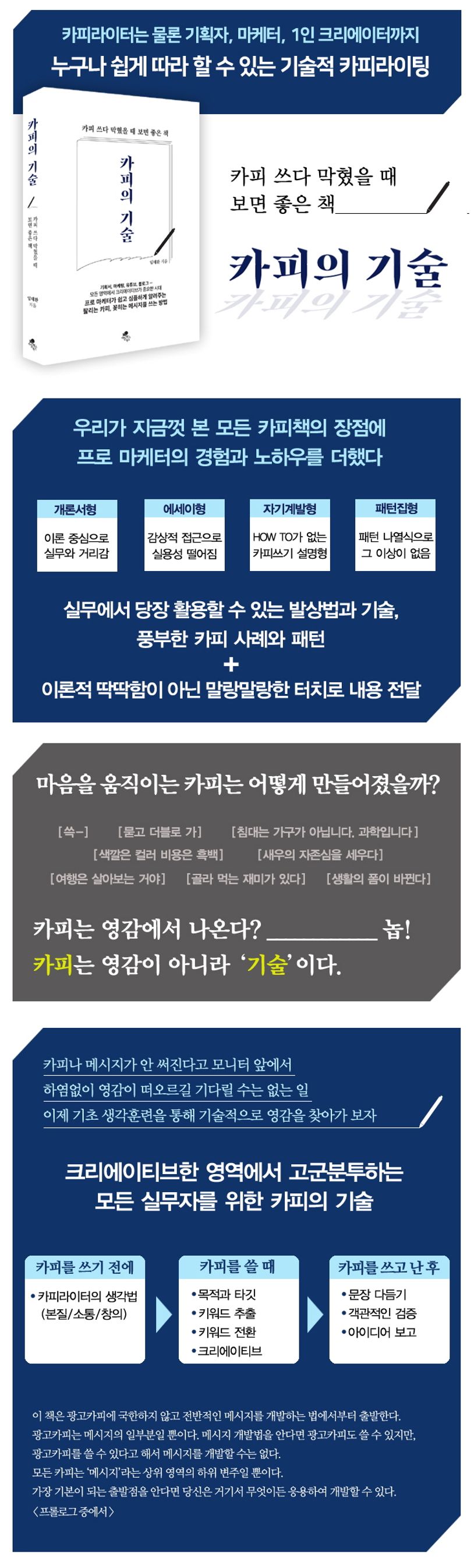 지금까지 우리는 많은 카피 책을 접했다. 이론 중심의 카피 개론서, 감상적인 접근 중심의 카피 에세이, 실용성이 떨어지는 자기계발형 카피 책, 다양한 카피 패턴을 나열한 책 등이 그렇다. 한 권 한 권 의미가 없지는 않지만 뭔가 허하다. 이 책은 그런 책들의 장점은 살리고 단점은 보완했다. 실무에서 당장 활용할 수 있는 발상법과 기술을 알려주되, 이론적인 딱딱함이 아니라 말랑말랑한 터치로 내용을 전달한다. 특히 실제 카피 사례와 패턴, 상황에 맞는 그림설명 들을 풍부하게 담아 내용을 더욱 쉽게 이해하도록 했으며, 단계별 카피 쓰기 실전 사례와 실습 미션을 담아 독자들이 각 설명 단계별로 직접 카피 쓰기를 경험할 수 있도록 구성했다.