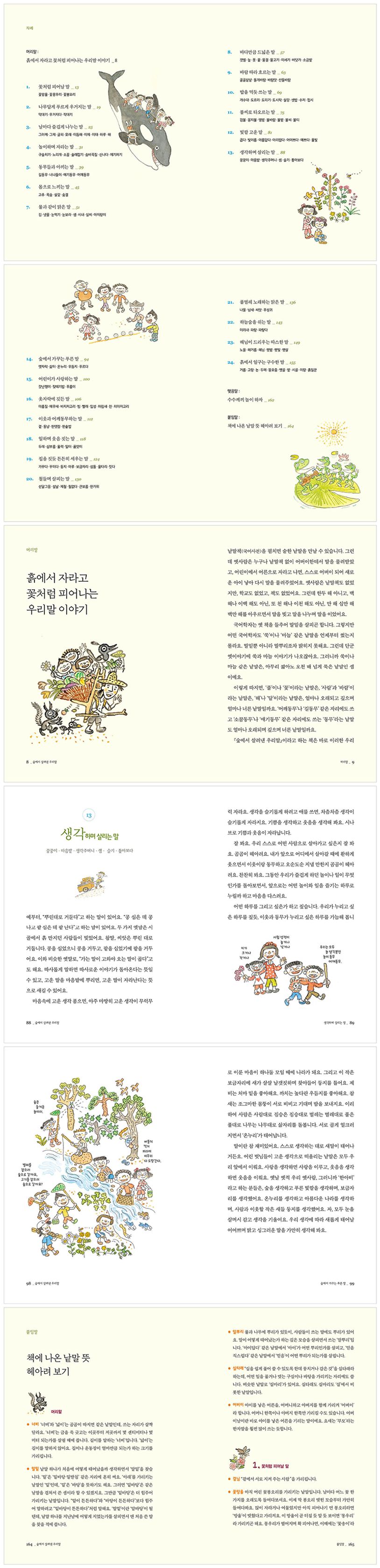 저자가 들려주는 꽃, 나무, 날, 놀이 등 24가지 우리말 이야기를 통해 이 책을 읽는 어린이들은 우리말에 담긴 우리 겨레의 넋을 배울 수 있습니다.