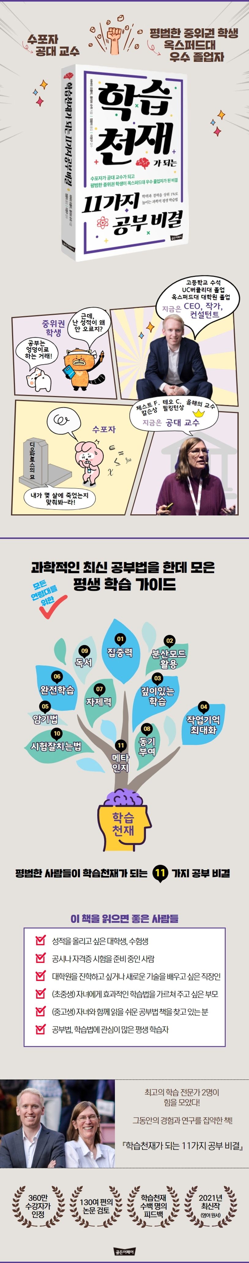『학습천재가 되는 11가지 공부 비결』에서는 가장 효과적인 학습 도구와 공부법을 엄선하였고, 뇌가 학습하는 원리를 제대로 이해하여 공부에 활용할 수 있도록 쉽게 설명한다. 또한 두 저자처럼 공부나 시험에 어려움을 겪고 있는 평범한 사람 누구나 이 책을 통해 효과적인 공부법과 다양한 도구를 활용하고 자신의 학습 방법과 상황을 평가하여 학습천재가 될 수 있도록 실용적인 가이드를 제시한다.