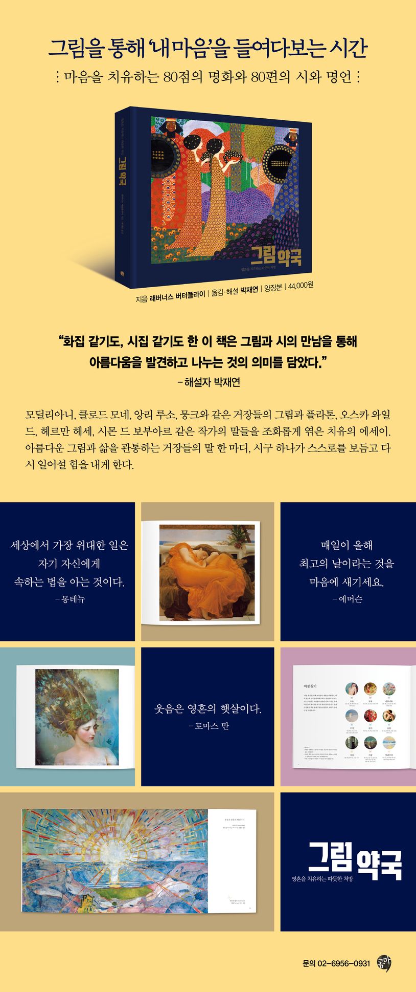 이 책은 모딜리아니, 클로드 모네, 앙리 루소, 뭉크와 같은 거장들의 그림과 플라톤, 오스카 와일드, 헤르만 헤세, 시몬 드 보부아르 같은 작가의 말들을 조화롭게 엮은 ‘치유의 에세이’입니다. 시대를 초월한 예술의 치유력을 경험하고, 필요할 때마다 열어보며 해답을 구할 수 있는 마음 처방전입니다.