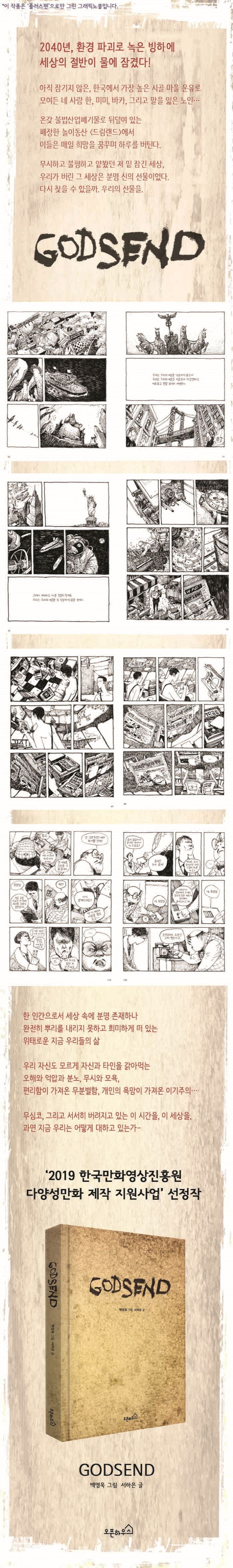 백영옥 그림, 서하은 글 『갓센드(GODSEND)』. 2040년, 급속히 발전한 산업화에 세상은 더 살기 편해졌지만, 중간중간 지구가 보낸 경고는 등한시했고 그 대책은 미비했다. 각국의 늦은 노력에도 불구하고 지구는 보란 듯이 무너졌다. 환경오염으로 녹은 빙하에 세상의 절반 이상이 잠기게 되고 살아남은 자들은 높은 곳을 찾아 정처 없이 떠도는 피난민이 되었다. 그렇게 세상은 서서히 멈춰졌다. 그해 12월, 기상이변화로 여름 같은 한겨울. 한국도 가라앉아 언제 폐쇄되었는지도 모를, 차차 수몰되고 남은 한국에서 제일 높은 동네에 있으나 온갖 불법산업폐기물로 가득 쌓여 폐장한 흉물스러운 놀이동산 〈드림랜드〉로 모여든 네 명의 생존기를 그렸다.