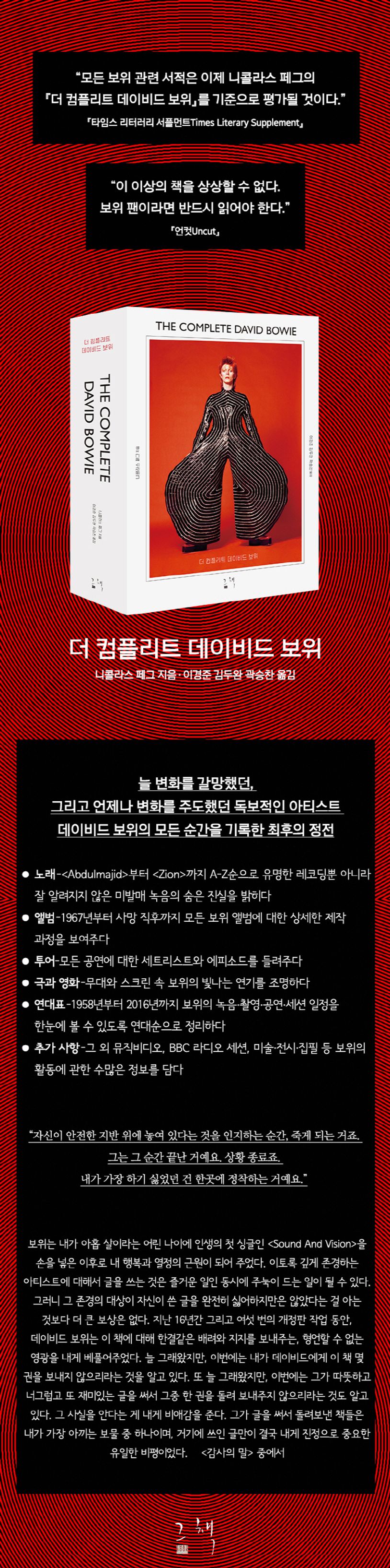 이 책은 보위가 1967년부터 고향인 우주로 돌아가기 전까지 작업한 모든 앨범에 대한 상세한 제작 과정을 보여주고, 〈Abdulmajid〉부터 〈Zion〉까지 A-Z순으로 유명한 레코딩뿐 아니라 잘 알려지지 않은 미발매곡들의 비화를 들려준다. 또, 보위가 참여한 모든 공연과 투어에 대한 세트리스트와 일대기를 담았고, 무대와 스크린 속 보위의 빛나는 연기 커리어를 조명하며, 뮤직비디오·BBC 라디오 세션·미술·전시·집필 등 보위가 활동했던 모든 순간을 정리했다. 1958년부터 2016년까지 보위의 녹음·촬영·공연·세션 일정을 한눈에 볼 수 있도록 정리한 연대표도 수록했다. 보위 백과사전과도 같은 『더 컴플리트 데이비드 보위』를 통해, 이 전설적인 뮤지션이 쌓아온 일생의 발자취를 살펴보며 영원히 꺼지지 않을 그의 숨결을 느낄 수 있을 것이다.