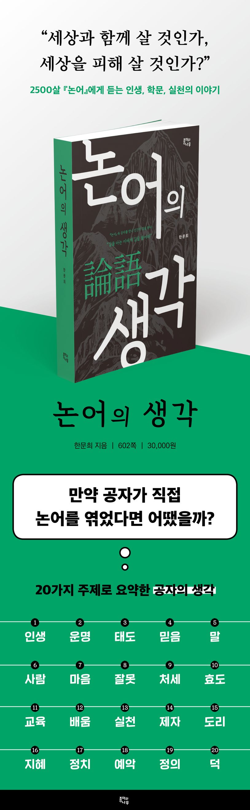 「논어」는 2500여 년 전 중국 춘추시대에 태어났다. 공자의 제자들이 그의 사후에 스승의 언행을 ‘논(論)’하면서 이 책을 엮었다. 책 제목을 「논어」라고 한 것은 이 때문이다. ‘학이’로부터 ‘요왈’까지 모두 스무 장으로 구성되어 있다. 그러나 첫 구절의 두 글자 또는 세 글자를 소제목으로 삼았기 때문에 이 제목만으로는 어떤 내용이 들어 있는지 짐작하기 어렵다. 「논어」에 담긴 공자의 생각은 대략, 인생, 운명, 태도, 믿음, 말, 사람, 마음, 잘못, 처세, 효도, 교육, 배움, 실천, 제자, 도리, 지혜, 정치, 예악, 정의, 덕의 스무 개 주제로 요약된다. 이 책에서 이들 스무 가지 주제로 소제목을 정한 이유는 이 때문이다.