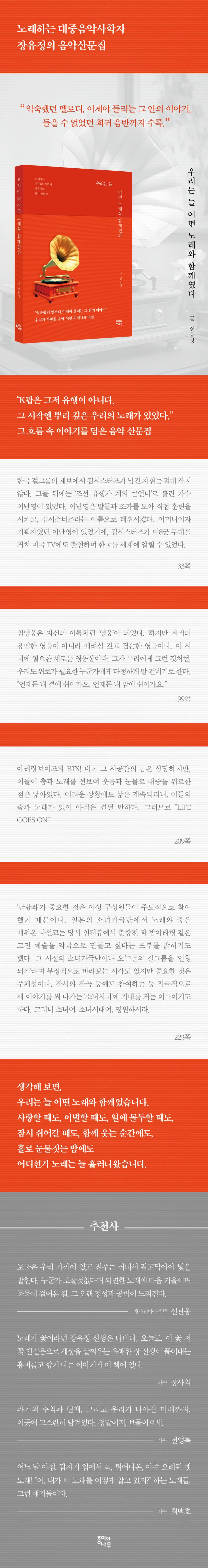 생각해 보면, 우리는 늘 어떤 노래와 함께였다. 노래는 우리의 기억이고 감정이며, 삶이고 사랑이며, 과거이자 현재이고 또 미래다. 다른 어디에서도 만날 수 없는 이야기와 노래가 당신을 기다린다. 지식과 감성, 그리고 듣는 즐거움까지 모두 담겨있는 이 책을 통해 음악과 삶이 만나는 특별한 경험을 해보는 건 어떨까?
