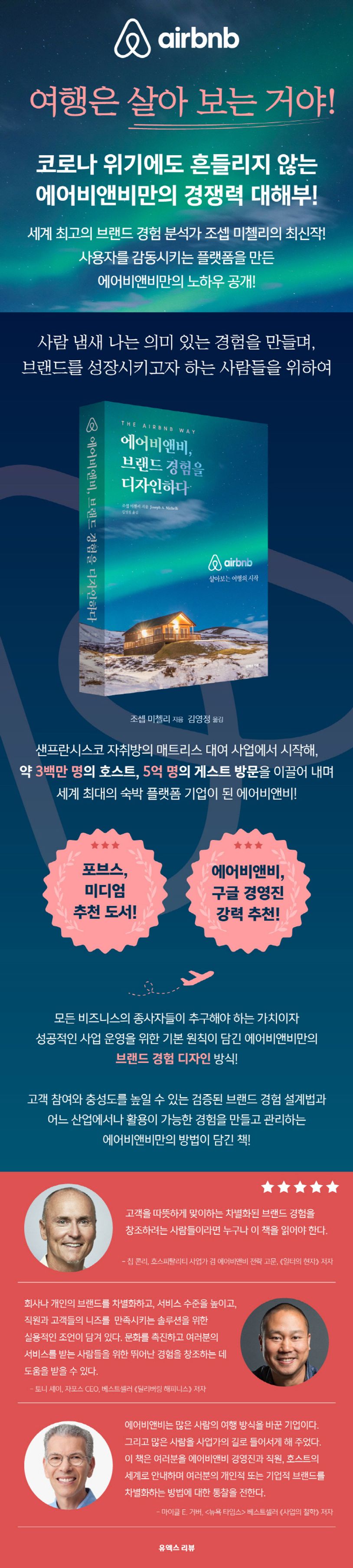 여행 산업의 새로운 패러다임을 만든 에어비앤비만의 브랜드 경험 설계법 대공개! 세계적인 브랜드 경험 분석가이자 베스트셀러 작가 조셉 미첼리가 에어비앤비의 경영진, 호스트, 게스트, 직원 등 모든 이해관계자와 만나 인터뷰하고 관찰하며 쓴 책. 에어비앤비가 그들의 여행 커뮤니티에 영감을 주고 능동적 참여를 유도한 경험 설계 방식을 설명하며 고유의 브랜드 경험을 설계하는 방법을 제시한다. 독자들은 대표적인 브랜드 경험 제공 기업 에어비앤비의 흥미로운 사례를 통해 독창적인 경험을 설계하는 법, 다양한 유형의 사람들과 소통하는 법, 그리고 고유의 플랫폼을 구축하면서 여기에 어떻게 사용자 경험을 반영하는지 등을 배울 수 있다.