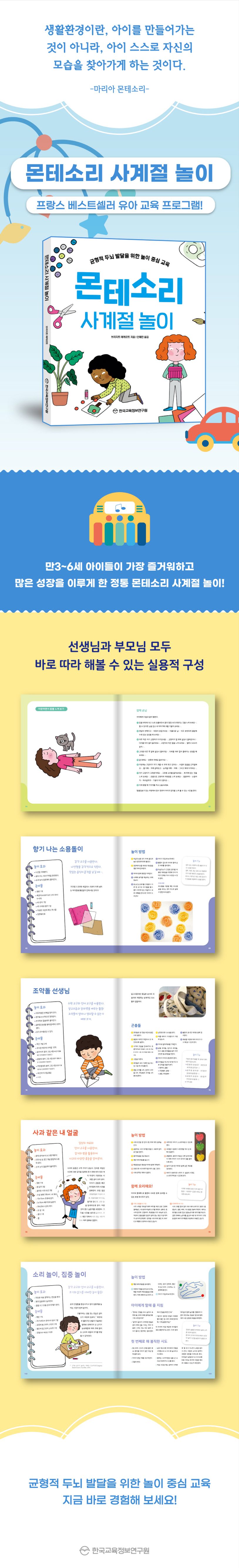 정통 몬테소리 교육법에 따라 계절별로 재밌게 할 수 있는 효과 만점 육아 놀이 안내서. 20세기 위대한 아동교육자 마리아 몬테소리의 교육 철학과 일상의 사계절 체험을 접목시킨 놀이 활동들을 소개한다. 풍부한 경험을 갖춘 문테소리 전문 교육자인 저자가 교육 현장에서 아이들이 가장 즐거워하고 많은 성장을 이룬 주옥같은 놀이 68가지를 엄선했다. 이 활동의 주요 대상은 언어가 급속도로 발달하고 ‘비상한 집중력’을 보이는 만 3~6세 아이들이다. 이 책은 이런 민감한 발달 과정에 있는 아이들을 자율적으로 다채로운 감각의 세계로 안내한다. 인지 능력, 상상력, 창의력, 운동 능력 등 아이의 성장에 필요한 중요 역량에 대한 핵심 조언과 놀이 방법을 알차게 구성했다.