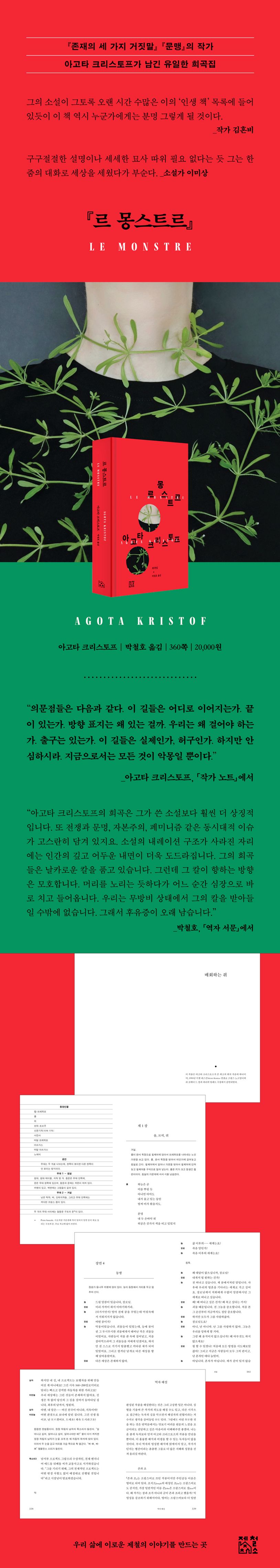 또한 희곡이라는 글쓰기의 특성상 대부분의 서사가 등장인물들의 ‘말’을 통해 전개된다는 점에서, 쉽고 간결하지만 많은 의미를 담은 아고타 크리스토프 언어만의 매력을 고스란히 느낄 수 있다. 아고타 크리스토프는 ‘읽기’와 ‘쓰기’에 대한 고뇌와 애정을 담은 자서전 『문맹』에서 이렇게 고백한다. “나는 태어날 때부터 프랑스어를 쓰는 작가들처럼은 프랑스어로 글을 결코 쓰지 못하리라는 사실을 알고 있다. 하지만 나는 내가 할 수 있는 대로, 할 수 있는 한 최선을 다해 쓸 것이다.” 국내에 처음 소개되는, 낯설고 기묘한 세계로 점철된 희곡집 『르 몽스트르』는 ‘문맹’이었던 한 작가가 낯선 언어를 어떤 방식으로 끌어안고 자기 세계 안에서 ‘소유’하는지 잘 보여준다.