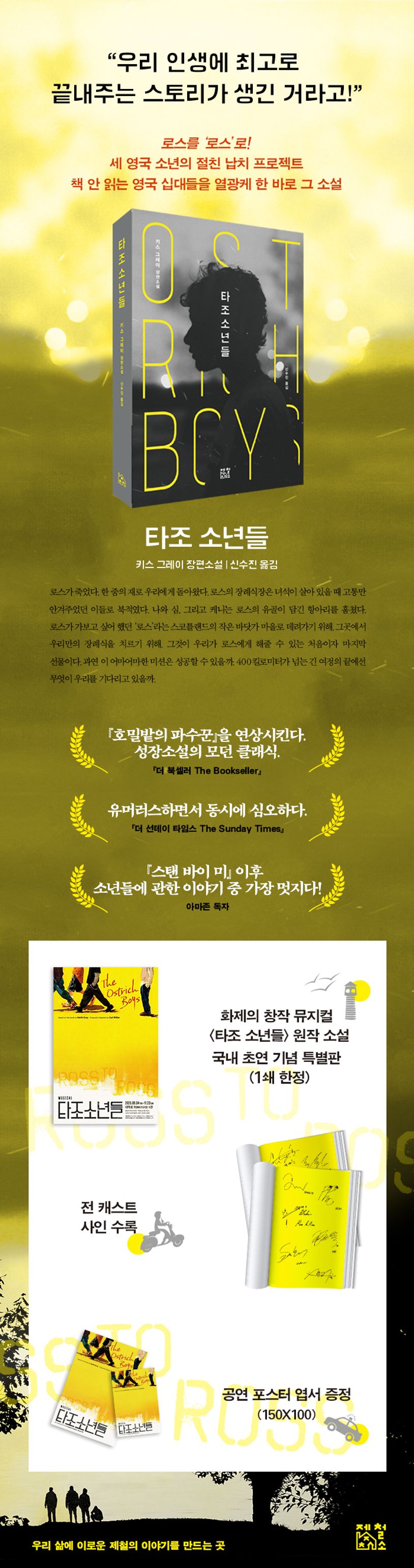 『타조 소년들』은 출간 당시 영국 내에서 단숨에 베스트셀러 자리에 오르며 선풍적인 인기를 끌었다. 특히 평소 책과 친하지 않은 십대 독자들의 열렬한 지지를 받았다는 점에서 많은 화제를 불러일으켰다. 또한 Carnegie Medal, Guardian Fiction Prize, BookTrust Teenage Prize 등 유수의 문학상 최종 후보에 이름을 올리는 영예를 안기도 했다. 2014년에는 영국 극작가 칼 밀러가 각색하고 토니 그래함이 연출한 동명의 연극을 국립극단이 세계 초연해 관객들의 뜨거운 사랑을 받았으며, 2025년에는 국내 창작 뮤지컬로도 제작되어 이 작품이 가진 스토리텔링의 힘을 다시 한번 증명했다.