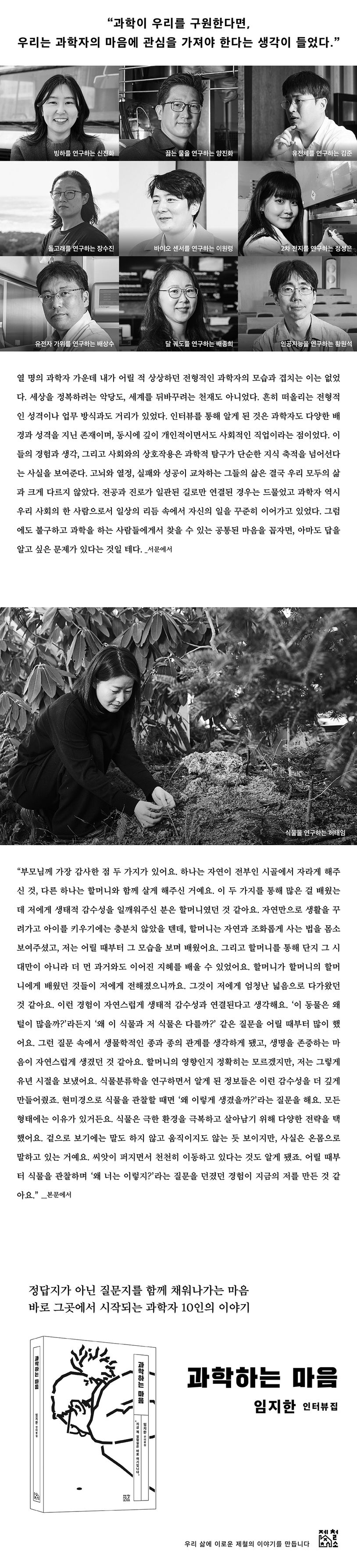 제철소 인터뷰집 시리즈 ‘일하는 마음’ 일곱 번째 책의 주인공은 과학자다. 대학에서 원자핵공학을 전공한 뒤 과학철학과 과학기술학으로 박사 과정을 마친 임지한 작가가 실험실에서 만난 국내 과학자들의 표정을 생생하게 담았다. 이 책에서 만나게 될 열 명의 과학자는 대상만 다를 뿐 모두 저마다의 질문을 품은 존재들이다. 그리고 그들의 마음에는 언제나 물음표가 깃들어 있다. 저자는 과학에 대한 애정을 기반으로 한 인터뷰를 통해 우리를 과학자들의 실험실로 이끈다. 무엇보다 낯선 과학 이론을 쉽게 풀어 전달한다는 점에서 과학 교양서로서도 손색이 없다.