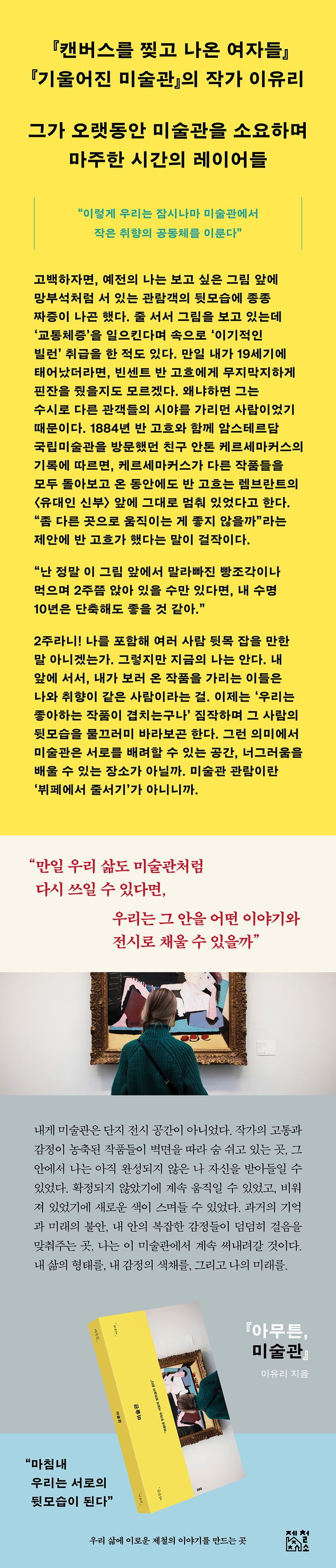 신문이나 잡지에서 오려낸 명화를 스크랩해 ‘나만의 미술관’을 만들던 유년의 기억에서 출발해 문턱이 닳도록 갤러리를 드나들었던 런던 어학연수 시절을 거쳐 천경자의 그림 앞에 서서 새로운 삶을 살기로 마음먹은 순간까지, 책 속에는 인생의 모퉁이를 돌 때마다 늘 마주쳤던 미술관에 관한 이야기들이 알알이 박혀 있다. 또한, 누구보다 미술관을 사랑하는 사람답게 액자와 굿즈, ‘무제’라는 제목을 단 작품에 얽힌 뒷이야기 등 우리가 미술관에서 무심코 스쳐 지나갔던 작은 것들에 대한 흥미로운 정보도 놓치지 않는다.