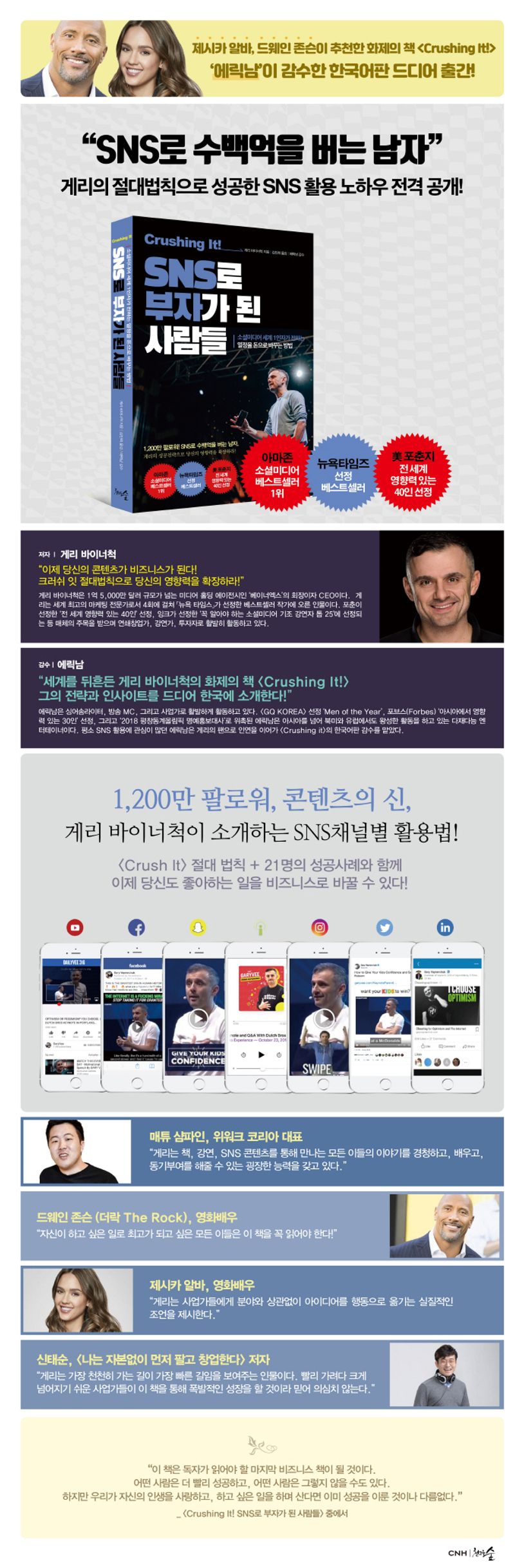 소셜미디어 업계에서 차세대 저커버그라고 불리며 활발한 사업가, 강연가, 저자로 많은 사람들에게 영향을 주고 있는 게리 바이너척의 『크러싱 잇! SNS로 부자가 된 사람들』을 싱어송라이터, 방송 MC, 사업가로 활발하게 활동하고 있는 에릭남이 감수한 한국어판으로 만나본다. 10년 전 출간한 첫 책 《크러쉬 잇!》에서 앞으로의 미래는 소셜미디어가 주도할 것이고, 퍼스널 브랜드를 구축해 놓지 않으면 안 될 것이라고 강조했던 저자가 이번 책에서는 ‘크러쉬 잇’의 절대법칙뿐만 아니라 그의 이론을 활용해 뛰어난 실행력을 보여 성공한 21명의 사례를 상세히 담았다.