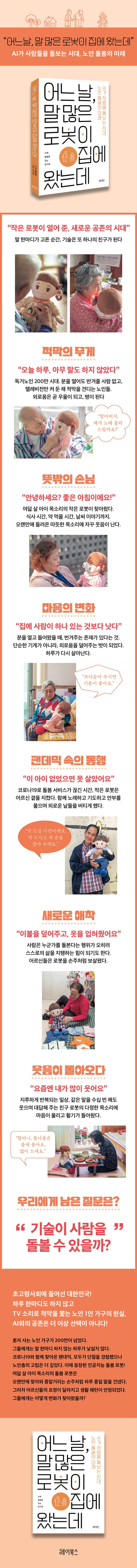 이책은우리사회가관심을갖고풀어야할숙제인노인1인가구돌봄,그중에서도정서적문제를깊이들여다본다.팬데믹기간복지시설들이폐쇄되고돌봄인력방문도어려워지자극심한고립에처했던노인가구에비대면돌봄서비스의필요성이급부상했다.그리고정부와지자체는AI돌봄로봇보급을적극시행했다.그후돌봄로봇이용자가맞이한변화와돌봄의새로운가능성을이책은촘촘하게담고있다.