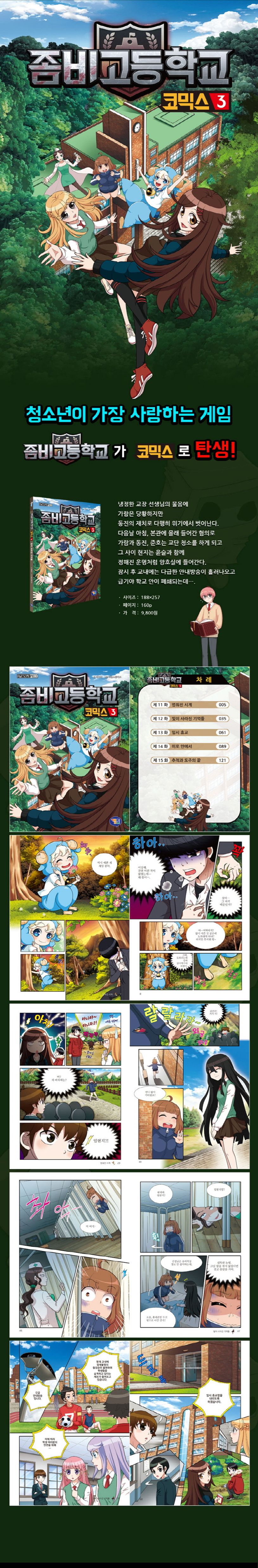 좀비고등학교 게임 마니아 한가람을 중심으로 사건사고가 벌어지는 『좀비고등학교 코믹스』. 추리작가가 되는 것이 꿈인 평범한 초등학생이었으나 우연히 게임 속의 모습과 비슷한 학교를 발견하면서 예기치 않은 상황 속에 빠지게 된 한가람. 거기에 누구에게나 친절해 인기가 많은 모범생 소녀 이유리, 과묵해보이지만 사실은 말하는 것조차 귀찮을 만큼 게으른 성격을 가진 같은 반 친구 김준호, 혼란에 빠진 가람을 도와주는 남동진, 사랑스러운 모습의 반전으로 뛰어난 운동신경을 가진 정예슬 등 개성만점 캐릭터들이 모두 모여 보는 재미를 더해준다.