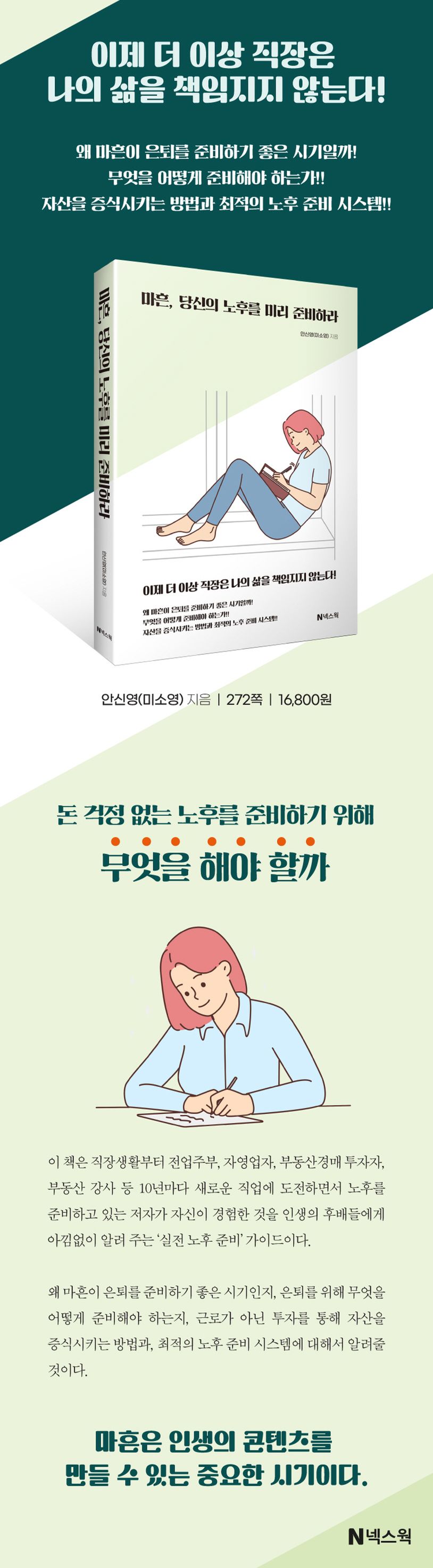 이번에 출간한 ‘마흔, 당신의 노후를 미리 준비하라’는 직장생활부터 전업주부, 자영업자, 부동산경매 투자자, 부동산 강사 등 10년마다 새로운 직업에 도전하면서 노후를 준비하고 있는 저자가 자신이 경험한 것을 인생의 후배들에게 아낌없이 알려 주는 ‘실전 노후 준비’ 가이드이다. 또한 왜 마흔이 은퇴를 준비하기 좋은 시기인지, 은퇴를 위해 무엇을 어떻게 준비해야 하는지, 근로가 아닌 투자를 통해 자산을 증식시킬 수 있는 방법과, 최적의 노후 준비 시스템에 대해서 알려 줄 것이다. 이제 더 이상 직장이 나의 삶을 책임지지 않거니와 ‘나는 무엇을 해야 할까?’ 하고 고민하는 독자들에게, 지금은 비록 돈이 없어도 노후는 돈 걱정 없이 살게 하도록 저자 자신의 진심을 담아냈다.