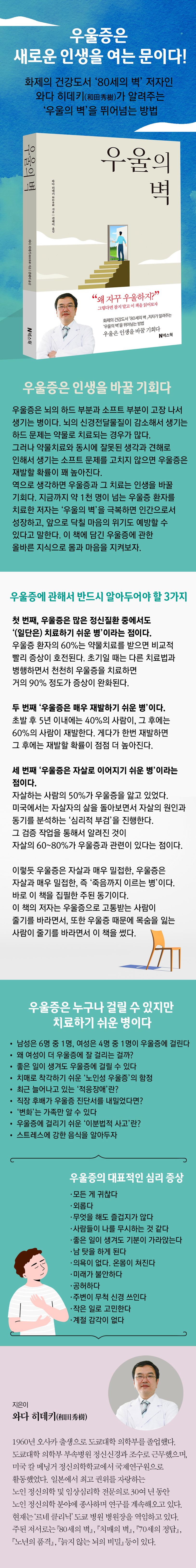 우울증은 뇌의 하드 부분과 소프트 부분이 고장 나서 생기는 병이다. 뇌의 신경전달물질이 감소해서 생기는 하드 문제는 약물로 치료되는 경우가 많다. 그러나 약물치료와 동시에 잘못된 생각과 견해로 인해서 생기는 소프트 문제를 고치지 않으면 우울증은 재발할 확률이 꽤 높아진다. 역으로 생각하면 우울증과 그 치료는 인생을 바꿀 기회다. 지금까지 약 1천 명이 넘는 우울증 환자를 치료한 저자는 ‘우울의 벽’을 극복하면 인간으로서 성장하고, 앞으로 닥칠 마음의 위기도 예방할 수 있다고 말한다. 이 책에 담긴 우울증에 관한 올바른 지식으로 몸과 마음을 지켜보자