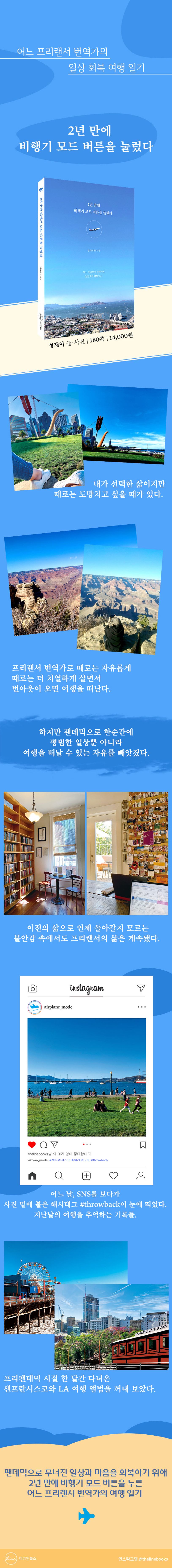 2019년 미국 캘리포니아로 한 달 동안 여행을 다녀온 후로, 팬데믹 때문에 한동안 여행을 떠나지 못했던 저자는 해외여행을 떠날 때 기내에서 누르던 비행기 모드 버튼을 까맣게 잊고 지낸다. 그러던 중 2년 만에 비행기 모드 버튼을 누르게 된다. 사회적 거리두기를 하는 동안에도 SNS로 수많은 사람과 초연결된 현대 사회에서 완전하게 혼자가 될 수 있는 시간을 자신에게 선사한 것이다. 자발적 단절을 선택하고 온전히 나 자신에게 집중하는 시간을 보내고 나면, 다시 일상으로 돌아와 사람들과 연결될 용기와 힘을 되찾게 된다.