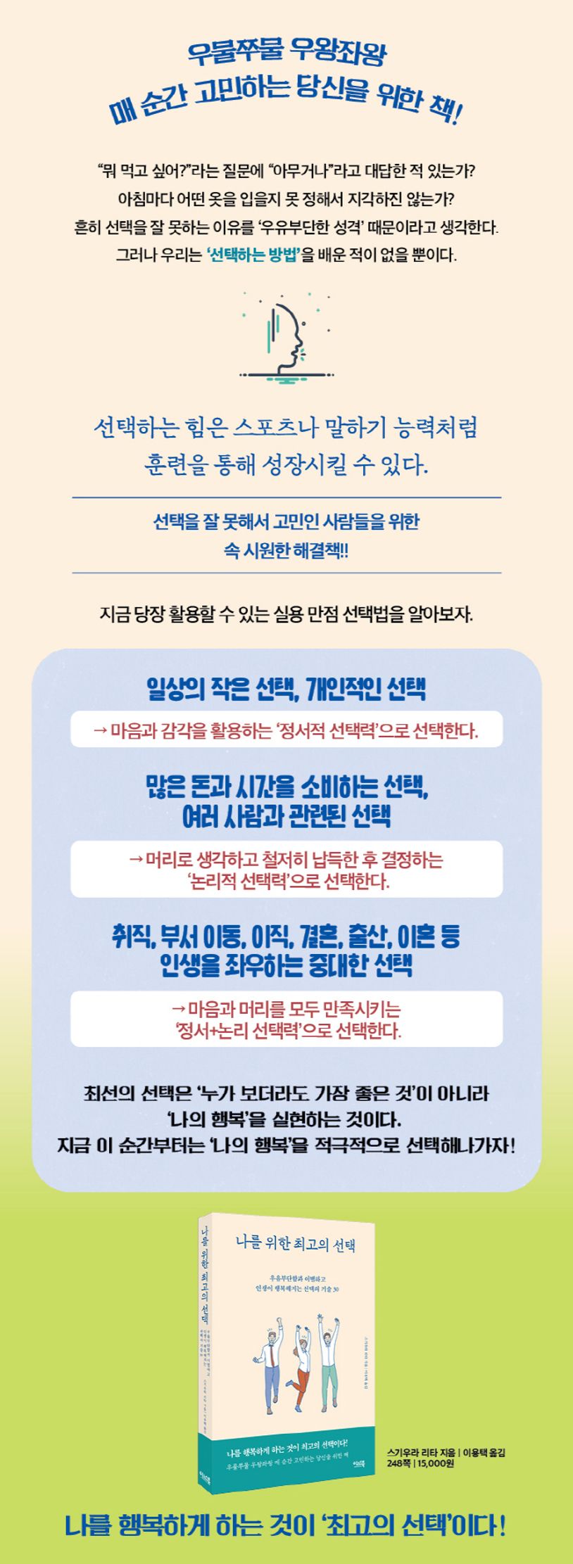 《나를 위한 최고의 선택》은 이처럼 선택에 어려움을 겪는 사람들을 위해 속 시원한 해결책을 제안한다. 책에서 제시하는 ‘정서적 선택력’과 ‘논리적 선택력’을 활용하면 일상의 자잘한 선택부터 일생일대의 선택에 이르기까지 쉽고 현명하게 선택할 수 있을 것이다.