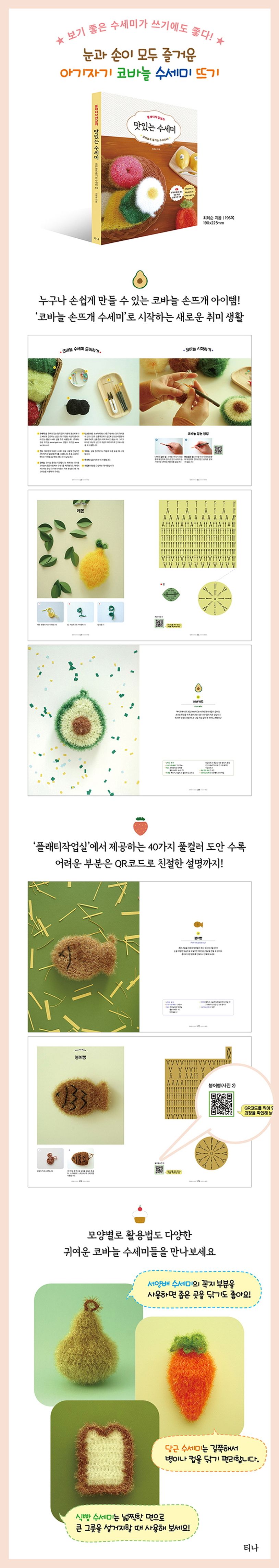 이 책에는 다양한 코바늘 수세미뿐만 아니라 뜨개질을 위한 기초 도구 설명부터 뜨개 방법에 대한 안내, 그리고 뜨깨와 함께 하면 좋은 간단한 자수 방법까지 함께 소개하고 있습니다. 특히 뜨개 방법에 대해서는 QR 코드를 함께 첨부하여 사진만으로는 자칫 어려울 수 있는 부분을 동영상을 통해 쉽게 보고 배울 수 있어 처음 뜨개질에 도전하는 초보자도 많은 도움을 받을 수 있습니다.