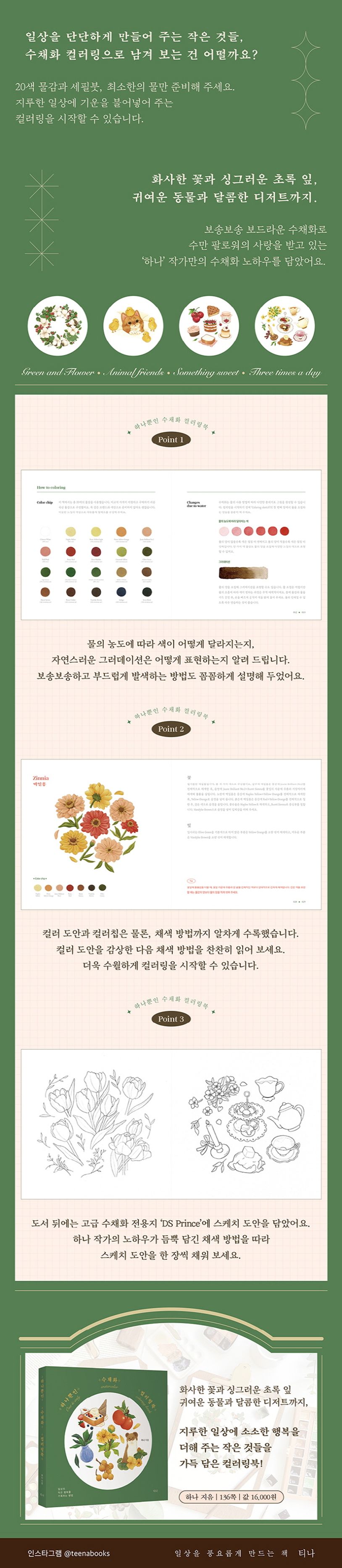 화사한 꽃과 싱그러운 초록 잎, 귀여운 동물과 달콤한 디저트까지. 지루한 일상에 소소한 행복을 더해 주는 작은 것들을 한 권의 컬러링북에 담았다. 꽃과 초록 잎을 컬러링하는 동안에는 우아한 매력을 느낄 수 있고, 보송보송한 동물을 컬러링할 때는 포근한 위로를 받을 수 있다. 디저트를 채색하는 동안에는 배부른 즐거움이 따라온다. 《하나뿐인 수채화 컬러링북》에서 알려 주는 컬러링 기초 이론을 배운 다음, 도톰한 수채화 전용지(DS Prince)에 인쇄된 컬러링 도안을 마음이 가는 대로 채워 보자. 어느새 또 다른 작은 행복이 찾아올 것이다.