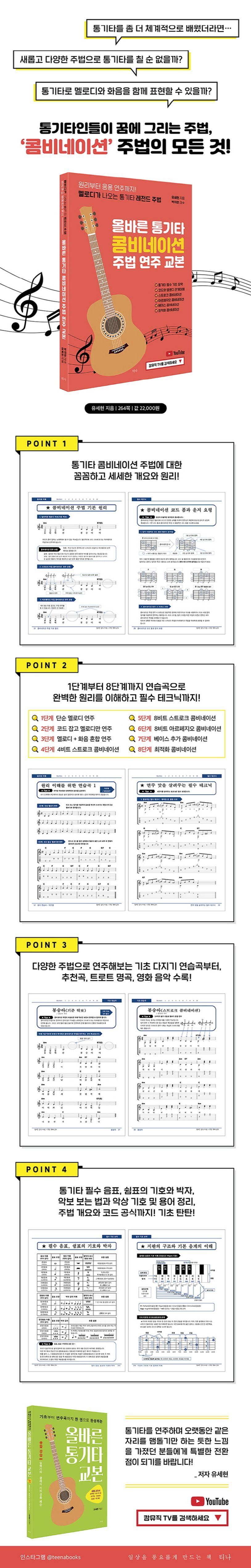 튼튼한 기초를 쌓을 수 있는 국내 최초의 통기타 콤비네이션 주법 연주 도서로 완성한 《올바른 통기타 콤비네이션 주법 연주 기본》과 함께 기타 한 대만으로 오케스트라 느낌이 나는 경음악의 연주세계로 빠져 들어보자!