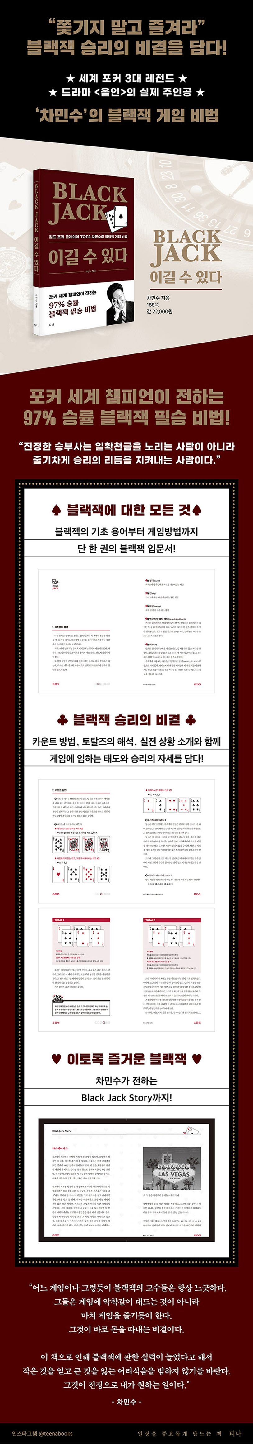 세계 3대 포커신 차민수의 신작 《블랙잭 이길 수 있다》는 한마디로 “쫓기지 않고 즐기는” 게임을 위한 블랙잭 전략서다. 드라마 〈올인〉의 실제 주인공으로, 1980~90년대 카지노 분야 수입 세계 1등에서 내려온 적이 없는 저자는 미국에서 카지노학 칩 존슨 교수에게 바둑을 가르쳐주고 포커를 배워 세계 최고 믹스게임 플레이어가 되었다. 그가 알려주는 블랙잭에서 이기는 비결은 1.5~2%의 유리한 확률을 가지고 있는 카지노의 우세를 뒤엎어버리는 비결인데, 실로 많은 공부와 훈련이 필요한 것이다.