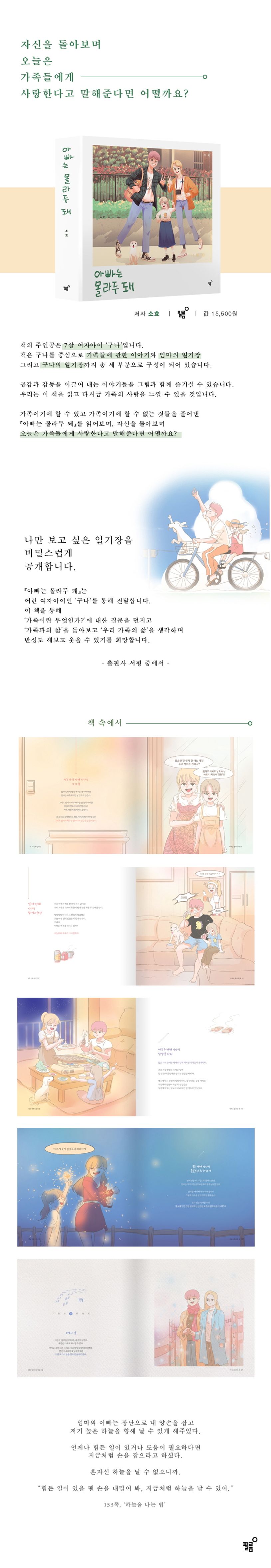 실제로 가족의 품 안에서는 그 소중함을 느끼기가 참 어렵습니다. 마냥 따뜻하고 언제까지나 내 곁에 함께할 것이라는 보이지 않는 믿음이 있어서겠죠. 하지만 언젠간 영원할 것 같았던 그 품은 점차 그 온기를 다해 사라지게 됩니다. 그리고 우리는 이 사실을 뒤늦게 깨닫곤 하죠. 《아빠는 몰라두 돼》는 어린아이의 시점과 부모의 시점, 그리고 어렸던 아이의 성장과정을 담아 진정한 ‘가족의 사랑’이 무엇인지 그려내고 있습니다. 뒤늦게 깨닫게 후회하기보단, 가족이기에 할 수 있고 가족이기에 할 수 없는 것들을 풀어낸 《아빠는 몰라두 돼》를 읽어보며, 자신을 돌아보고 가족들에게 사랑한다고 말해준다면 어떨까요?
