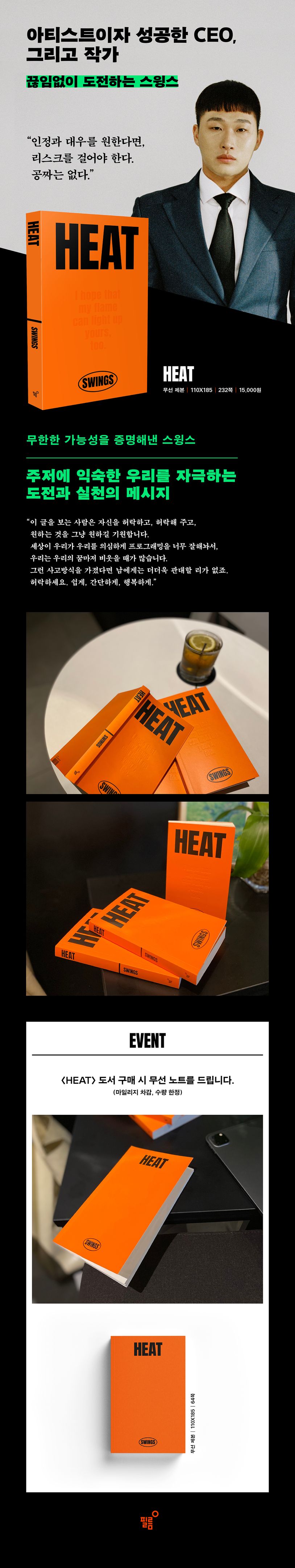 늘 자신의 이슈를 도전과 당당함으로 증명해 온 스윙스는, 『HEAT』를 통해 다시금 그의 존재감을 보여주고자 한다. 『HEAT』는 30대가 넘어서면서 좀 더 성숙하고 단단해진 내면을 과감하고 솔직한 그만의 스타일로 담아낸 에세이다. 마치 직접 그와 함께 대화를 나누는 듯한 느낌이 들 정도로 문장마다 그의 플로우가 고스란히 느껴져, 이야기에 몰입하게 만든다.
