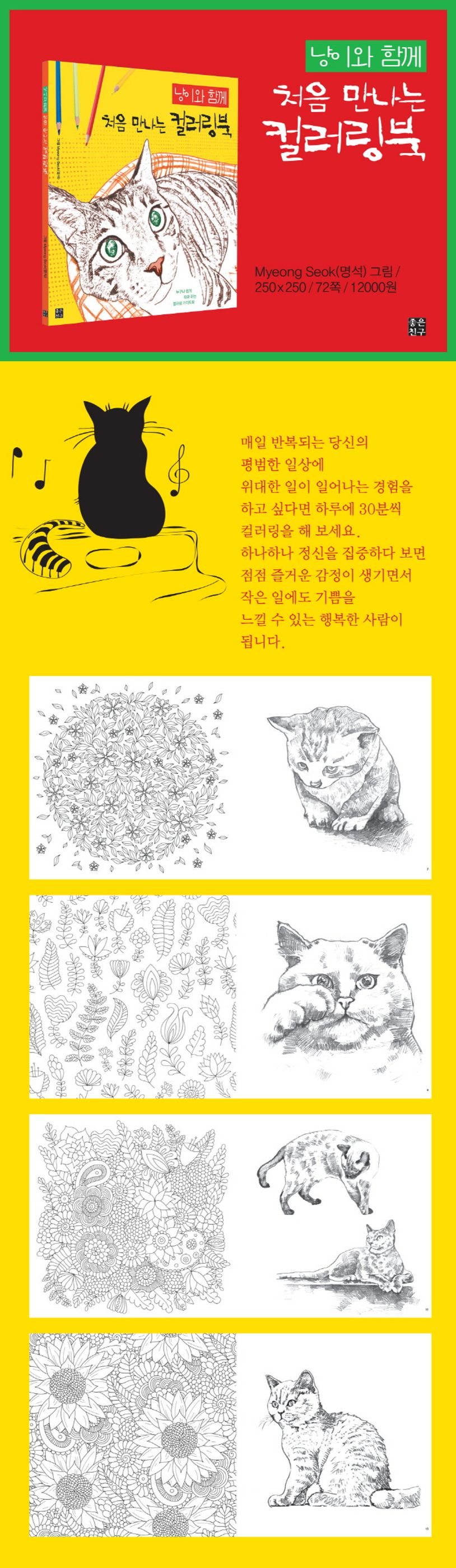 귀여운 고양이 등 다양한 그림이 스케치 되어있는 이 책은 그림에 자신이 없는 초보자도 가벼운 마음으로 색칠할 수 있으며, 일상을 살아가는 현대인에게 스트레스 해소와 심리적 안정을 갖게 해주며 아이들 뿐만 아니라 성인들의 취미생활에도 손색이 없는 컬러링북입니다.