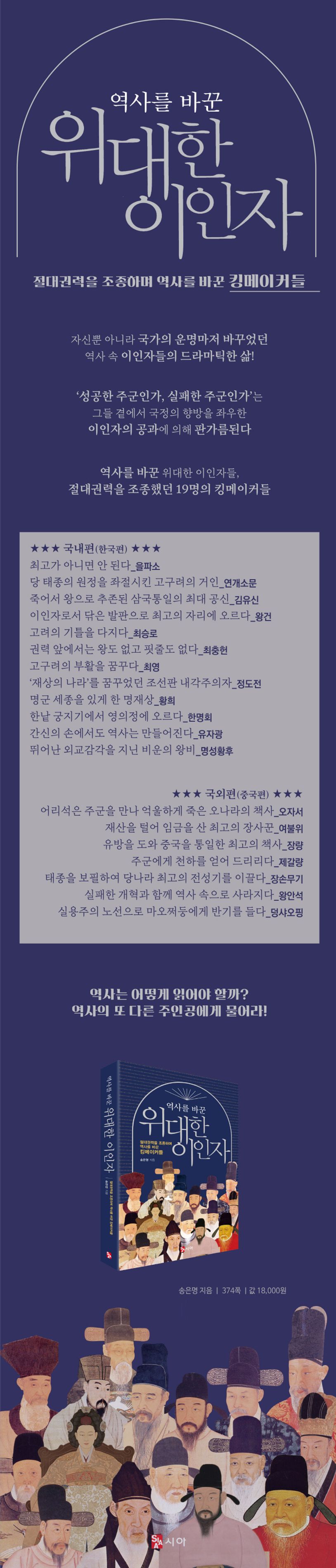 역사의 수레바퀴를 돌린 〈위대한 2인자들〉. 한국사 · 중국사에서 역사의 큰 흐름을 주도한 대표적인 ‘이인자’ 19명을 소개하였다. 당대의 일인자인 주군을 성심성의껏 보필하여 성군의 자리에 올려놓은 이인자는 물론, 이름뿐인 일인자 밑에서 사실상 모든 권력을 쥐고 흔들었던 이인자의 이야기도 담고 있다. 인물들의 옳고 그름을 평가하기보다는, 이들이 바꾼 역사에 주목하고 있다.