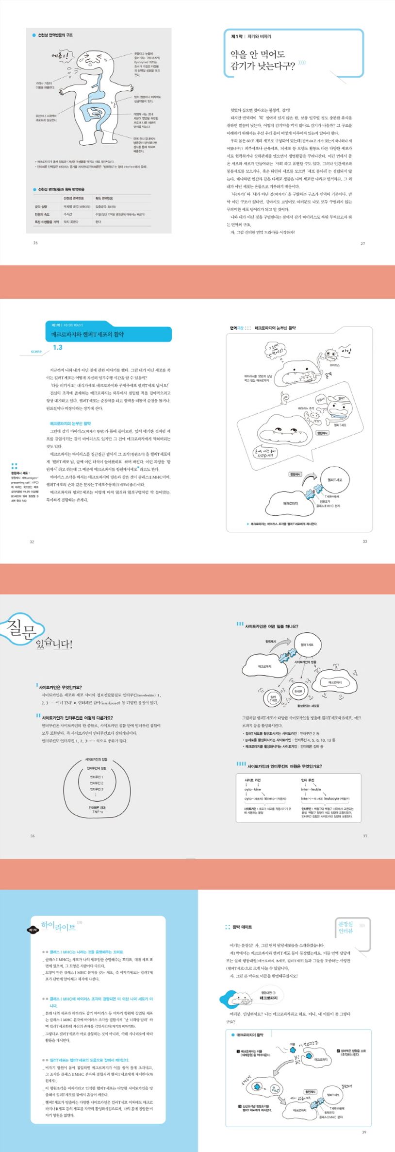 그리고 항원이 몸 안에 침입하면 림프구에 해당하는 항체(T세포와 B세포)가 어떻게 대항하는지 역시 귀엽고 깜찍한 만화를 곁들여 쉽고 편하게 볼 수 있게 해준다. <여기서 잠깐>, <하이라이트> 등을 통해서 자칫 복잡해 보이는 면역체계를 친절히 설명해주기도 한다. 그리고 면역과 관계된 신체기관의 구조에 관한 설명도 곁들여 놓았다.