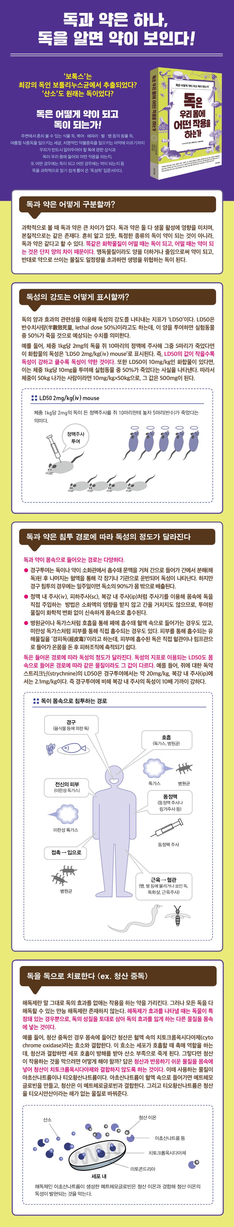 ● 과학 전문작가이자 저널리스트인 다나카 마치가 방대한 자료 수집과 취재를 통해 생활 속 독 이야기를 과학적으로 알기 쉽게 풀어 쓴 ‘독성학’ 입문서이다. 일반인들이 쉽게 접근할 만한 독성학 관련서를 찾아보기 어려운 현실 속에서 독성학 대중화의 문을 열었다.