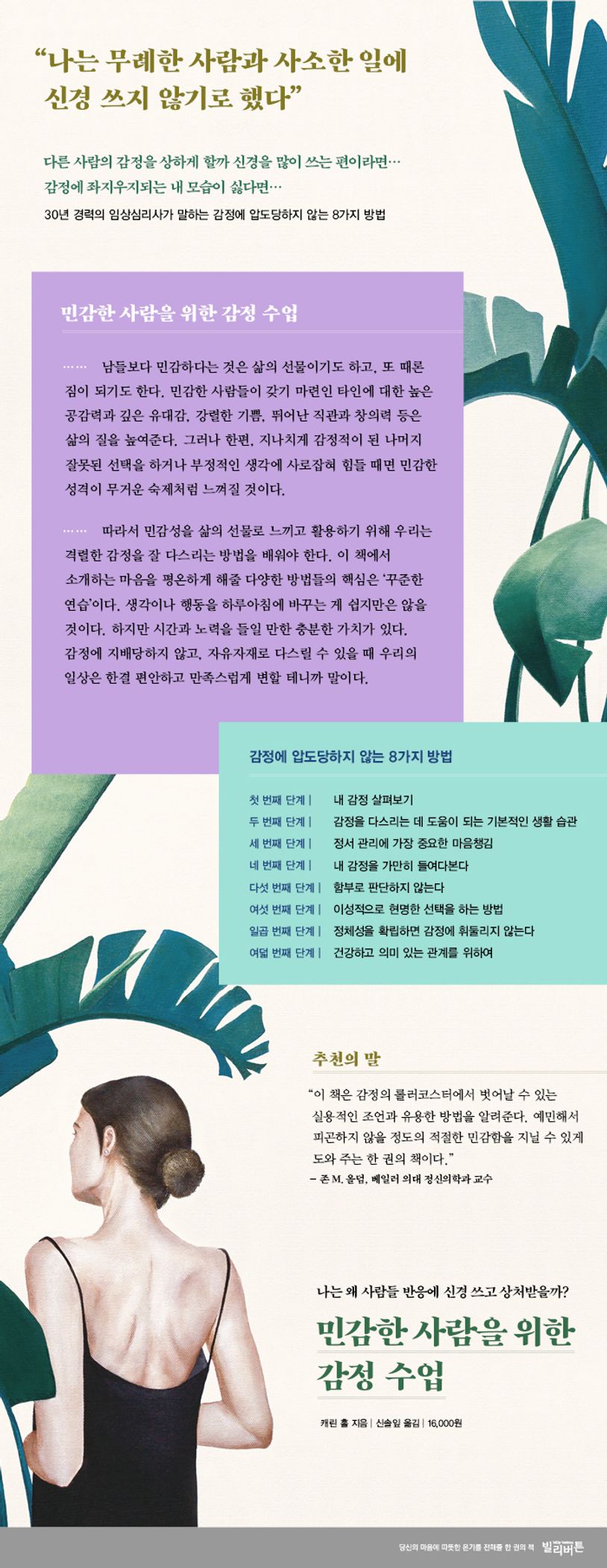 남들보다 민감하다는 것은 삶의 선물이기도 하고, 또 때론 짐이 되기도 한다. 민감한 사람들이 갖기 마련인 타인에 대한 높은 공감력과 깊은 유대감, 강렬한 기쁨, 뛰어난 직관과 창의력 등은 삶의 질을 높여준다. 그러나 한편, 지나치게 감정적이 된 나머지 잘못된 선택을 하거나 부정적인 생각에 사로잡혀 힘들 때면 민감한 성격이 무거운 숙제처럼 느껴질 것이다.