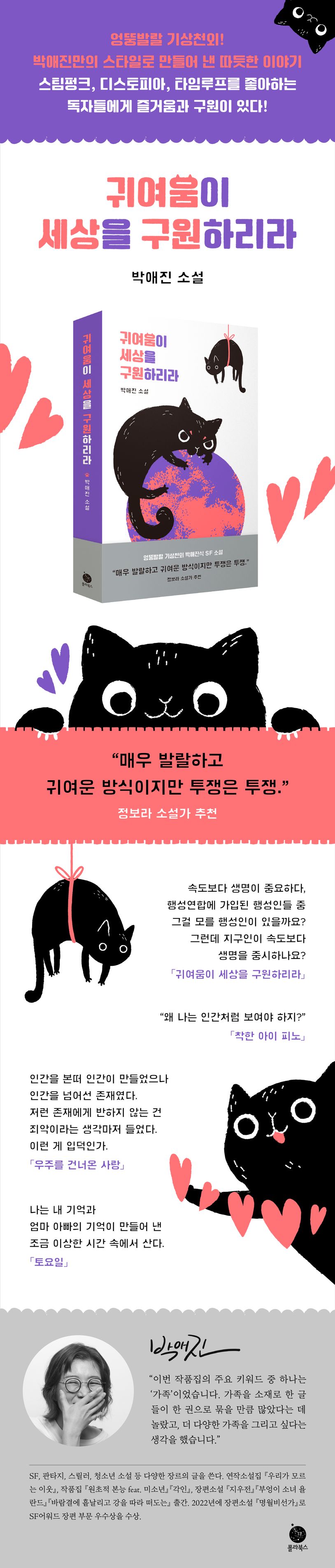 SF, 판타지 소설을 쓰는 박애진 소설가의 소설집 『귀여움이 세상을 구원하리라』를 현대문학에서 출간한다. 「심청전」, 「피노키오」와 같은 고전작품을 오마주 하여 쓴 단편과 판소리「옹고집타령」을 재해석한 단편에 더불어 박애진만의 스타일로 만들어 낸 기상천외한 SF 단편을 총 8편 담았다. 엉뚱발랄하고도 따듯한 이 소설들의 주요 키워드는 ‘가족’이다. 다양한 가족을 이야기하고 싶었던 소망을 연인으로, 아이돌로, 고양이로 그려 냈다.