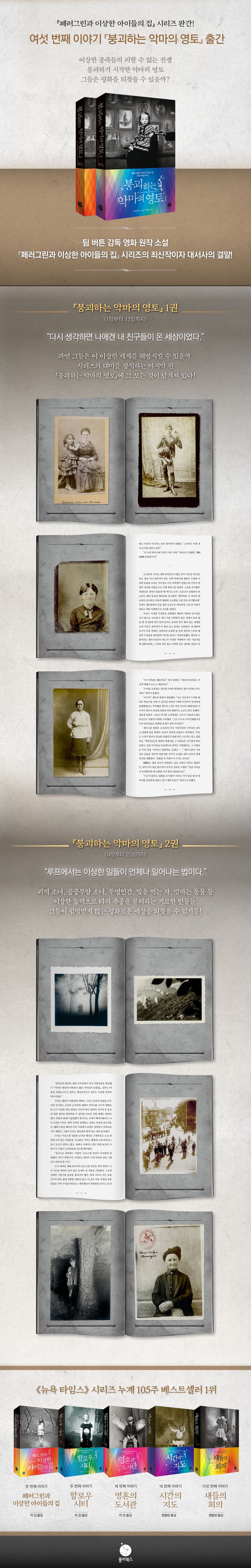 2011년 『페러그린과 이상한 아이들의 집』을 시작으로 『할로우 시티』『영혼의 도서관』『시간의 지도』『새들의 회의』, 마침내 『붕괴하는 악마의 영토(1, 2권)』까지 출간하며 총 7권에 이르는 이 대장정의 시리즈를 완간한다.