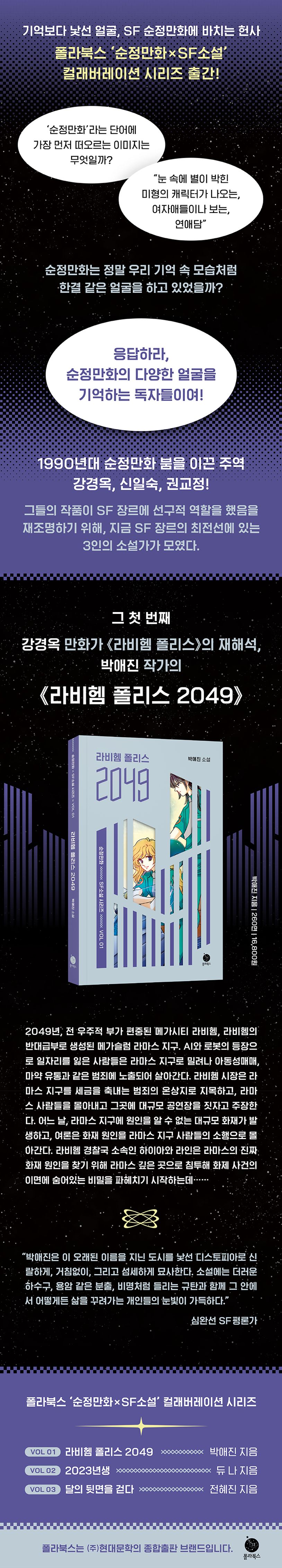 이야기 본연의 재미와 뚜렷한 색깔을 가진 장르문학을 소개해 온 현대문학의 종합 출판 브랜드 폴라북스에서 새로운 기획물 ‘순정만화XSF소설’ 시리즈를 출간한다. 1990년대 순정만화 붐을 이끈 주역인 강경옥, 신일숙, 권교정! 그들의 작품이 SF 장르에 선구적 역할을 했음을 재조명하기 위해 SF 장르의 최전선에 있는 3인의 소설가 박애진, 듀나, 전혜진이 모였다. 시리즈의 첫 번째인 박애진 작가의 《라비헴 폴리스 2049》는 《라비헴 폴리스》에서 4년이 흐른 뒤의 이야기다.