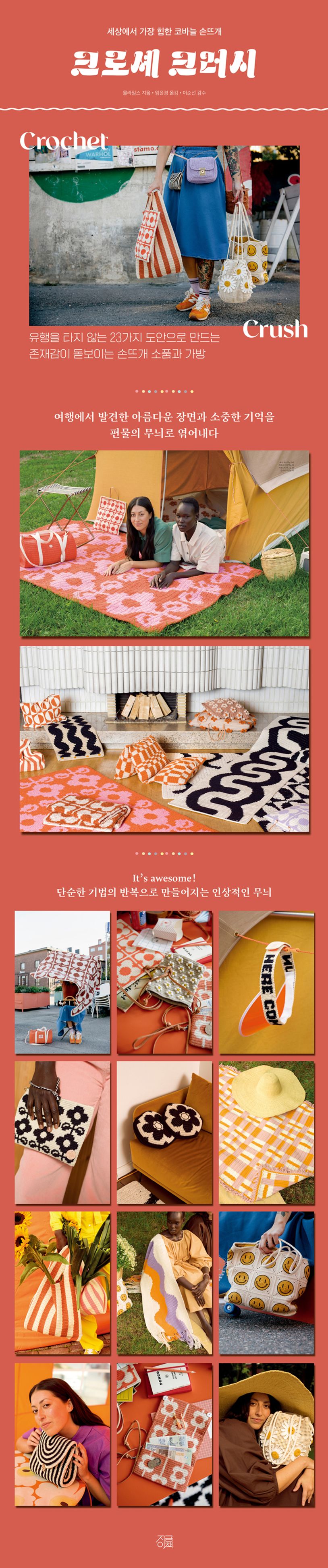 핀란드의 코바늘 손뜨개 작가 몰라 밀스의 최신 도안집이 국내에 소개된다. 저작이 10개국 언어로 번역 출간되었을 정도로 세계적인 사랑을 받고 있는 베스트셀러 작가답게, 이번 도안집도 크로셰터들 사이에서 많은 기대를 모았다. 간단한 기법으로 일정한 무늬를 반복하기만 해도 강렬하고 인상적인 작품이 완성된다는 점이 《크로셰 크러시》의 가장 큰 매력이다.