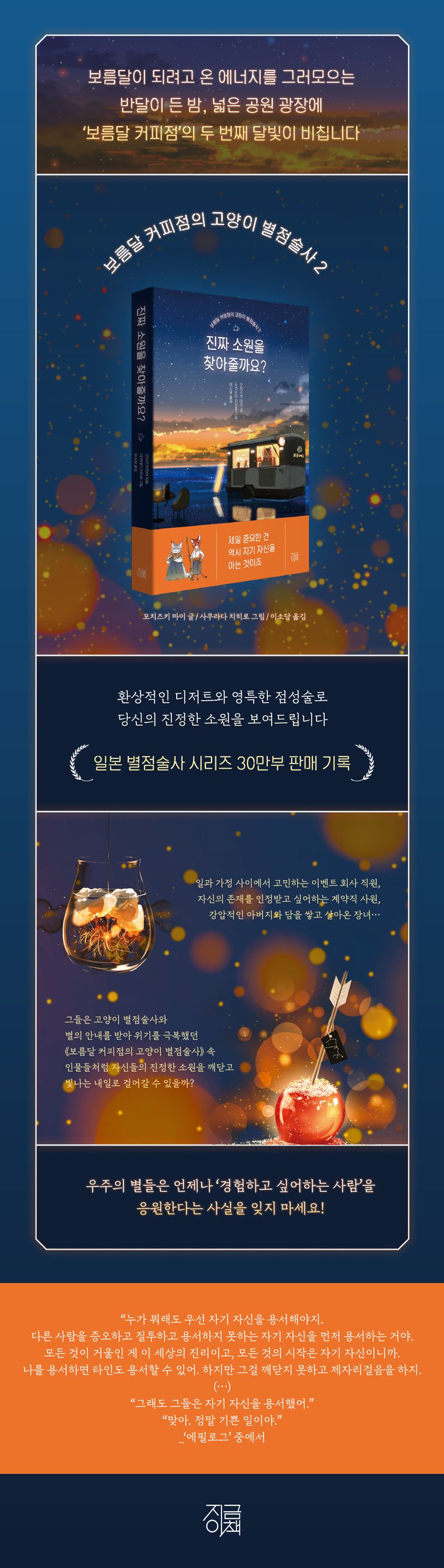 《진짜 소원을 찾아줄까요?》는 사쿠라다 치히로의 환상적인 일러스트에서 영감을 받아 MZ세대의 새로운 이야기꾼 모치즈키 마이가 완성한 별점술사 시리즈의 두 번째 작품입니다. 이번에는 일과 결혼 사이에서 고민하는 이벤트 회사 직원, 아버지가 돌아가신 후 애써 밝고 착한 사람으로 연기하며 살아온 계약직 사원, 강압적인 아버지와 담을 쌓고 살아온 장녀 캐릭터들이 냉철하고 다정한 고양이 별점술사의 안내를 받아 자신의 진정한 소원을 깨닫게 되는 이야기를 담고 있습니다. 1편보다 풍부한 맛과 다채로운 비주얼을 지닌 맞춤형 디저트와 음료가 어김없이 별처럼 반짝이는 스토리 속에 별첨처럼 등장합니다. 심화된 월궁 별자리 해석을 통해, 미처 모르거나 외면했던 진짜 자신의 소원을 찾게 도와주는 ‘보름달 커피점’의 불빛 속으로 여러분을 초대합니다. 신비로운 ‘보름달 커피점’의 마법같은 조언은 지금의 나를 알고 받아들이는 첫걸음이 될 것입니다.